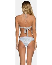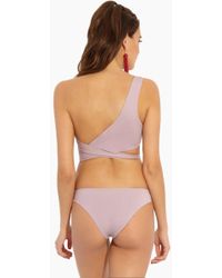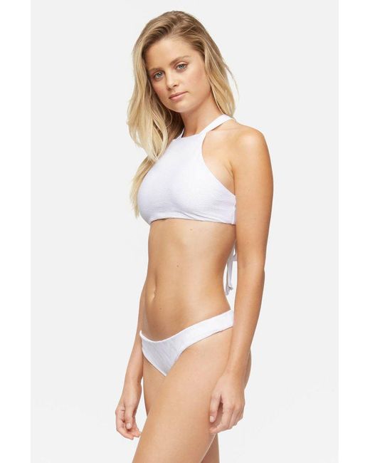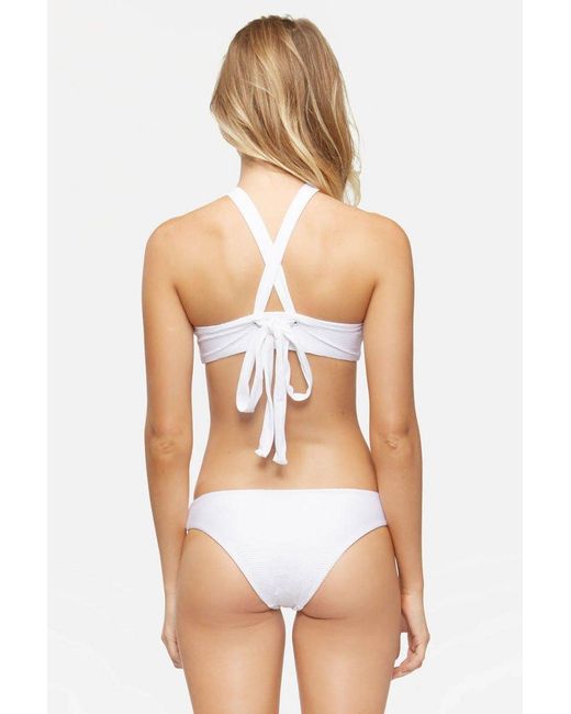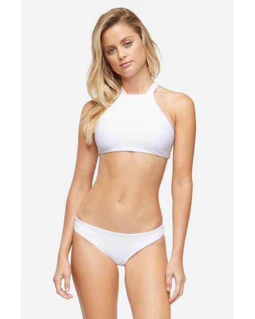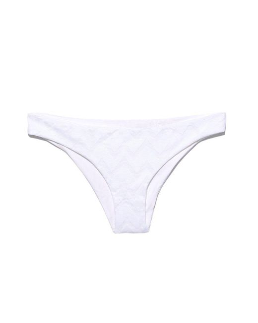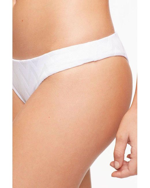 STYLE: Low-rise textured cheeky bikini bottom in bright white. Crafted from a premium Italian textured amalfi fabric in a chevron pattern for a smooth feel and modern edge. Easy pull-on style in seamless fabrication perfect for laid-back beach days. Fabric features a rating of UPF 50 to keep your skin protected from the sun's harmful UV rays. Moderate rear cut shows off your curves while providing cheeky coverage. Pair with the Tavik Alcamy bikini top in white textured chevron. CARE: Hand wash in cold water with gentle detergent and lay flat in the shade to air dry. Nylon/spandex blend. Colour: white