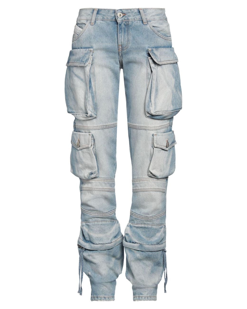THE ATTICO. cargo jeans, denim, tie-dyed, embroidered logo, light wash, low waisted, regular fit, zip fastening, 1 button, pockets, machine wash or dry clean, do not bleach, do not tumble dry. 100% Cotton.