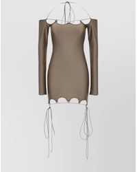 Go to TheBSThe 'Lyna' dress from The Attico exemplifies modern elegance. Made from shiny military lycra, this slim-fit piece features a flared neckline and hem, complemented by long sleeves and a unique scalloped edge. Adjustable