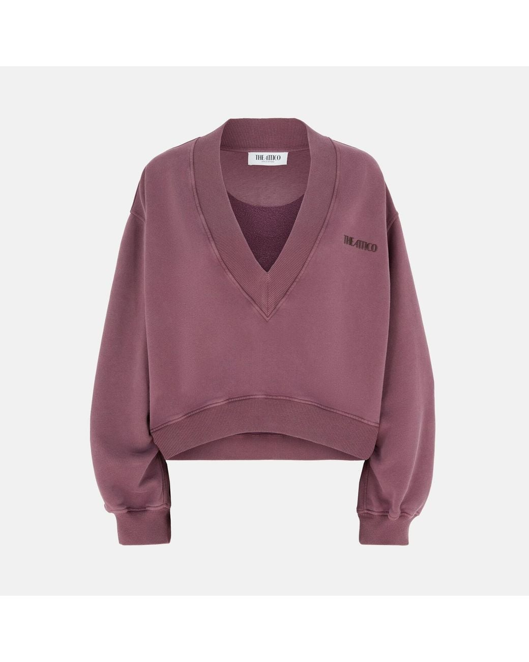 THE ATTICO Sale gend Mauve fade sweatshirt Mauve fade. Oversize sweatshirt in mauve fade american fleece with deep v neckline and thick rubberised logo print. Made in Italy. Sweatshirt. . . Main Material: 100% cotton, rib: 95% cotton 5% elastane. Colour: purple