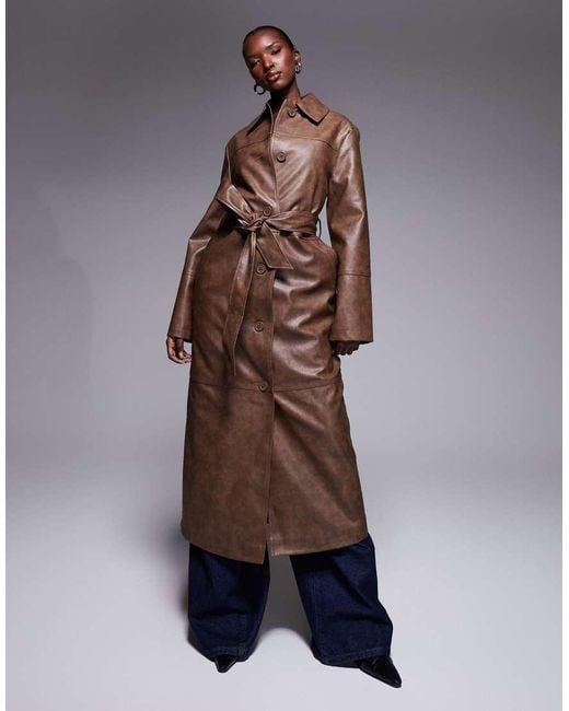 Women's Brown Exclusive Leather Look Button Through Belted Maxi Coat