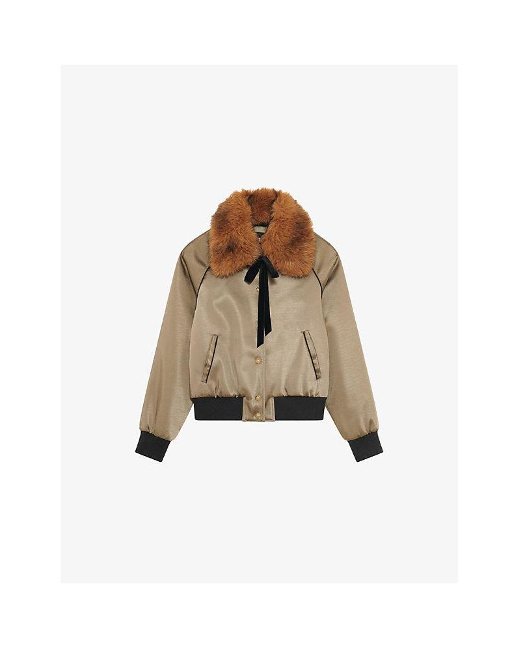 Women's Brown Faux Fur-Collar Tie-Detail Satin Jacket