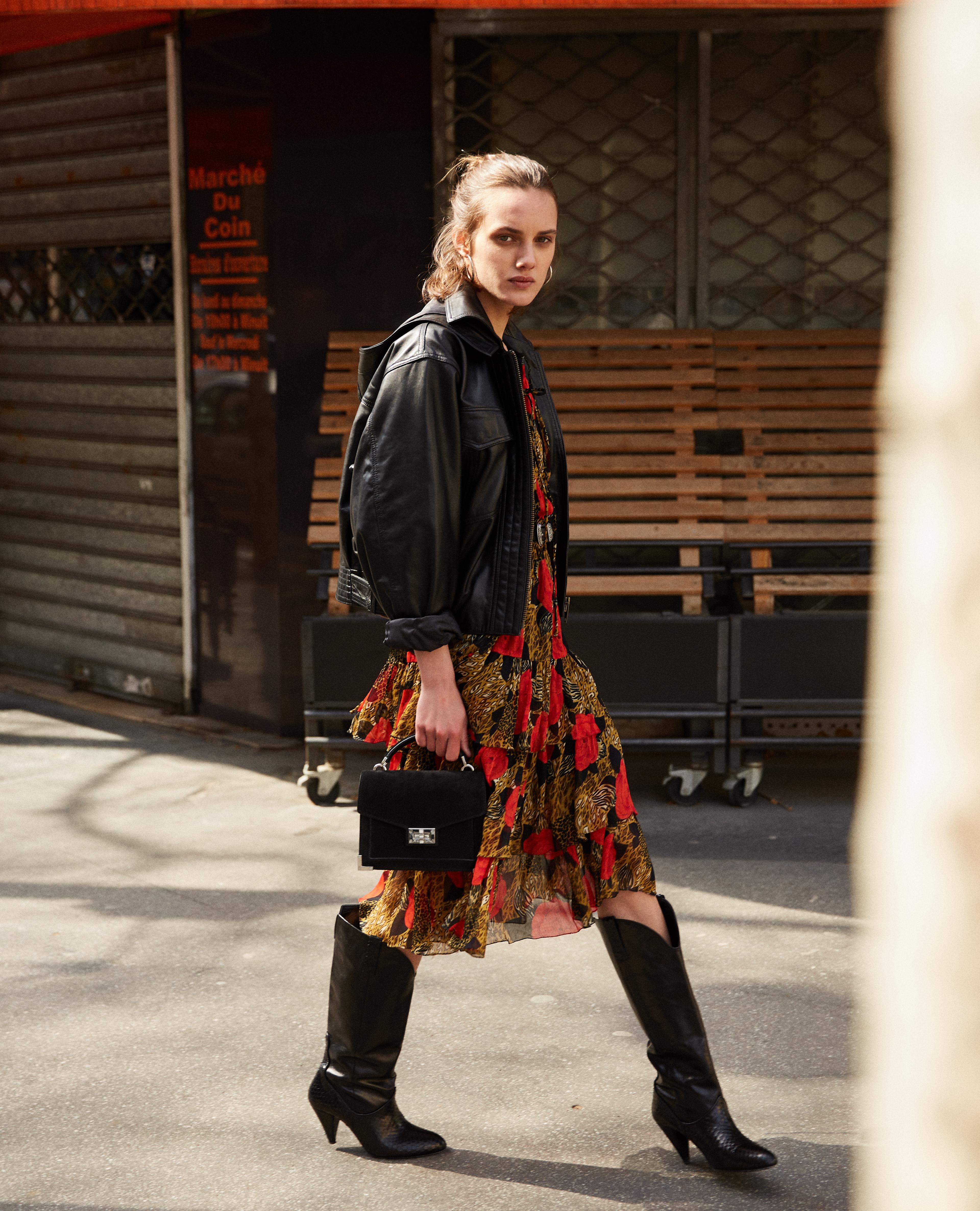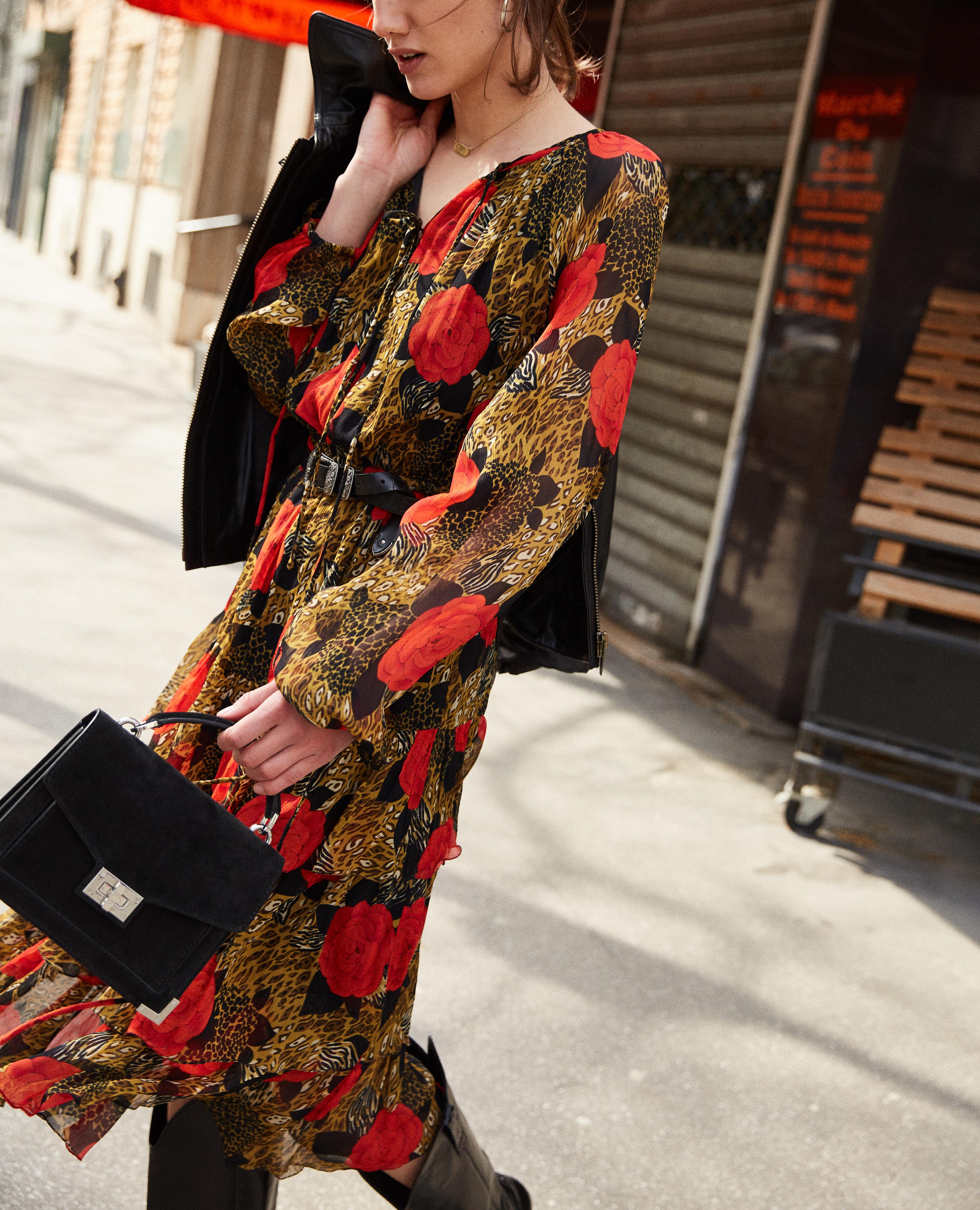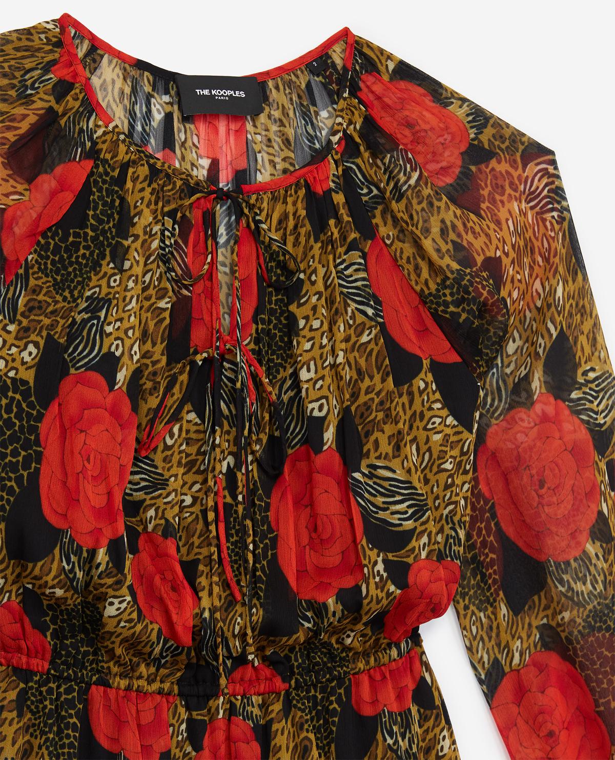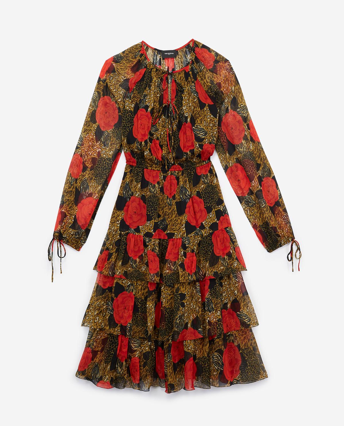 Go to The KooplesElegant and complete with floral Jungle Flower motif, this long dress made from light, floaty viscose beautifully highlights your figure. Brought to life by its cascading frills and fringed inserts, the neckline and totally see-through sleeves give this item a glamorous touch. This dress can be worn with a belt to highlight your waistline. Lining : 100% polyester. Exterior : 100% viscose. Do not wash. Do not bleach. Do not tumble dry. Iron at low temperature. Dry clean, tetrachloroethylene (PCE) only. Colour: red