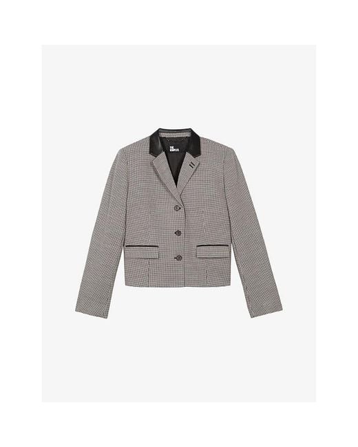 Women's Grey Houndstooth Contrast-Collar Stretch Wool-Blend Jacket