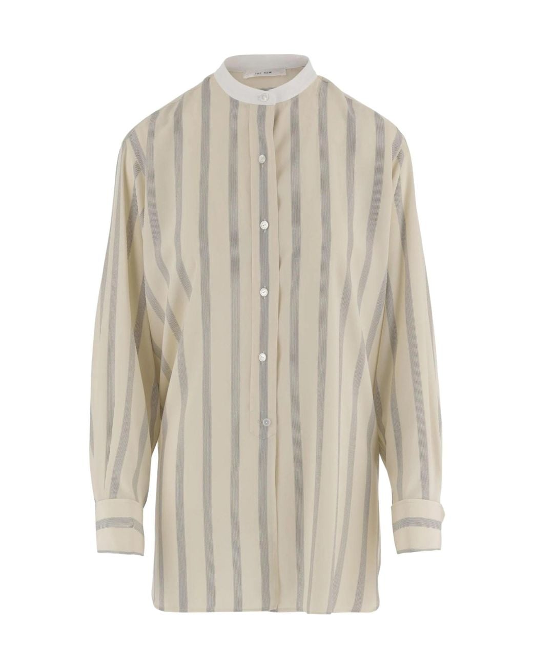 Mandarin collar Long sleeves Front button closure Straight hem Striped design Colour: white