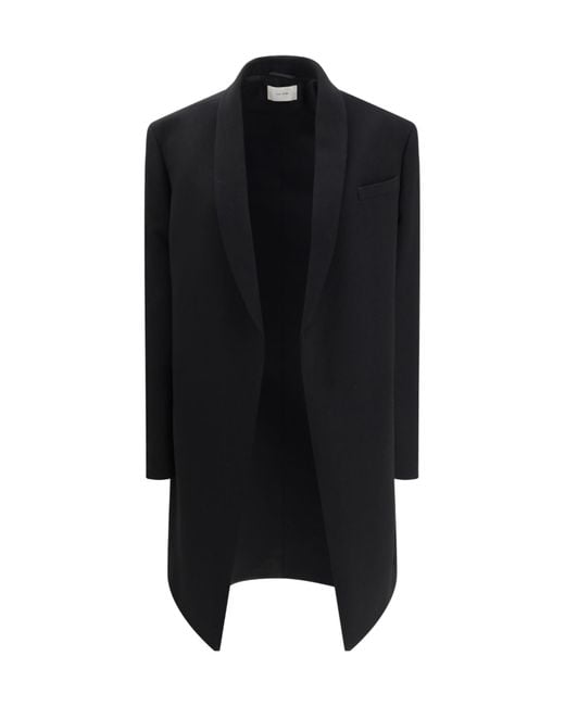 Long sleeves, turn-down collar, concealed front closure. Colour: black