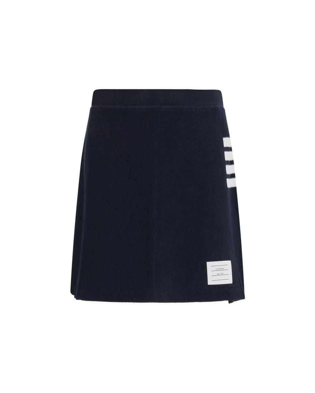 The 4-bar piqué mini Skirt by Thom Browne features box pleats that add volume and movement. The 4-bar detailing, a distinctive symbol of the brand, and the name tag appliqué add a touch of recognizability. The grosgrain striped loop tab with signature completes the look, creating a mix of elegance and sportiness. A sophisticated and modern garment, perfect for a preppy and contemporary look. Season: SS26Fit: RegularComposition: 100% Cotton. Colour: blue