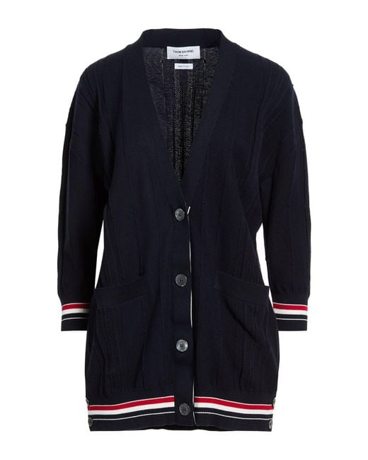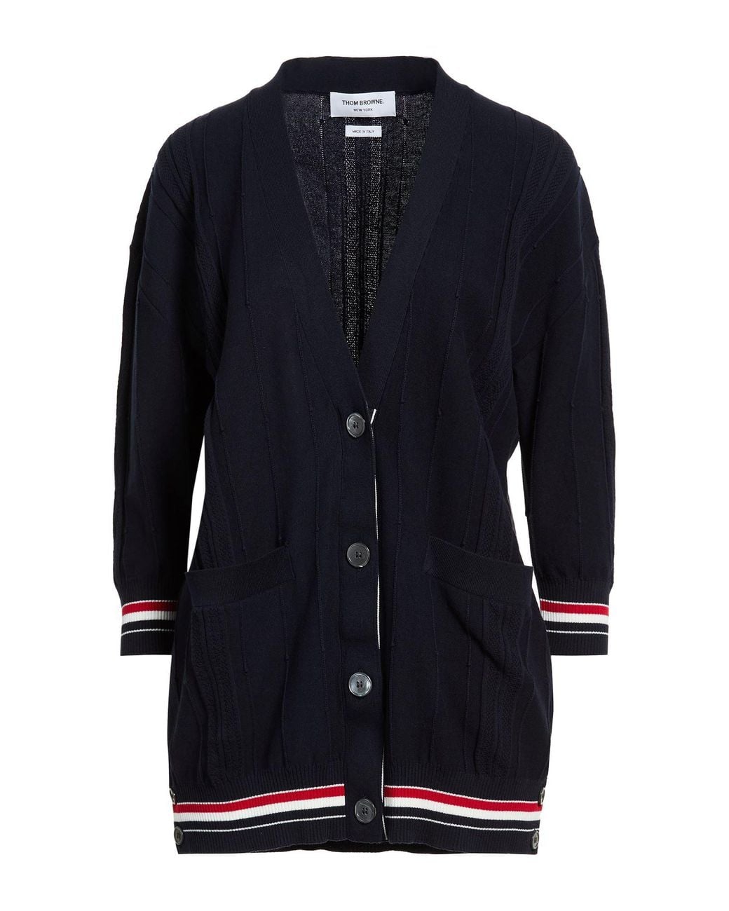 THOM BROWNE. knitted, lightweight knit, piped trims, plain colour with appliqués, long sleeves, unlined, patch pockets, dry clean, do not bleach, do not tumble dry. 100% Cotton.