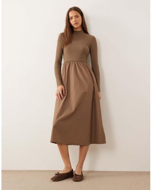 Women's Natural High Neck Jersey Poplin Mix Midi Dress