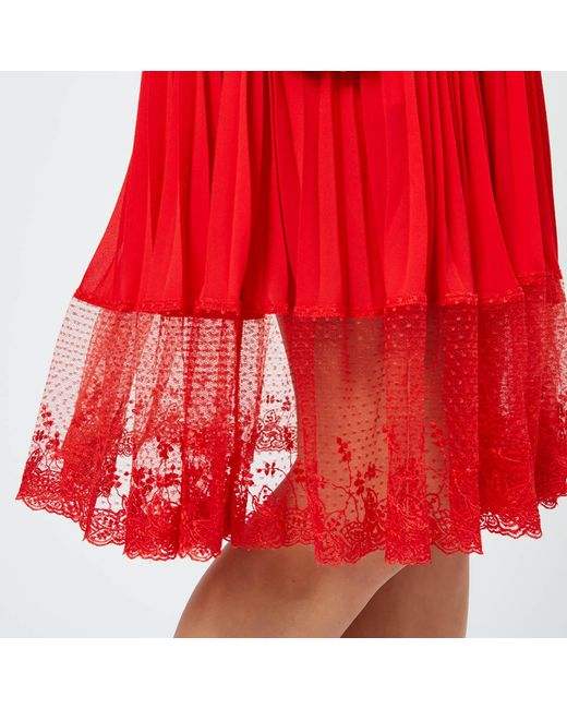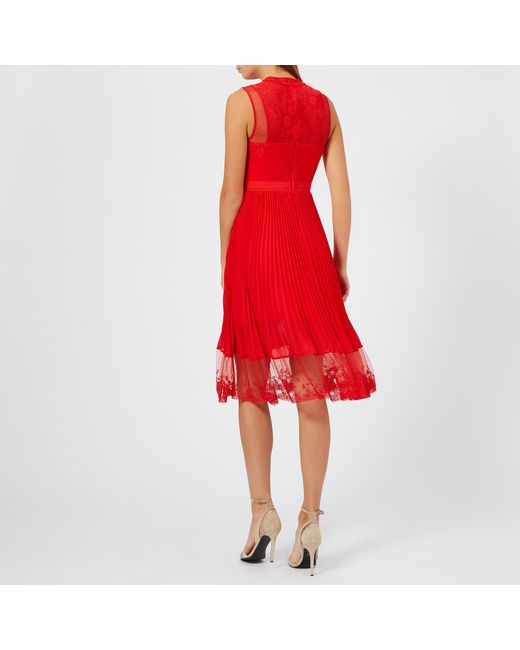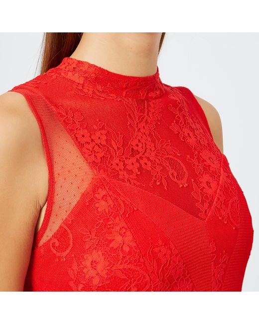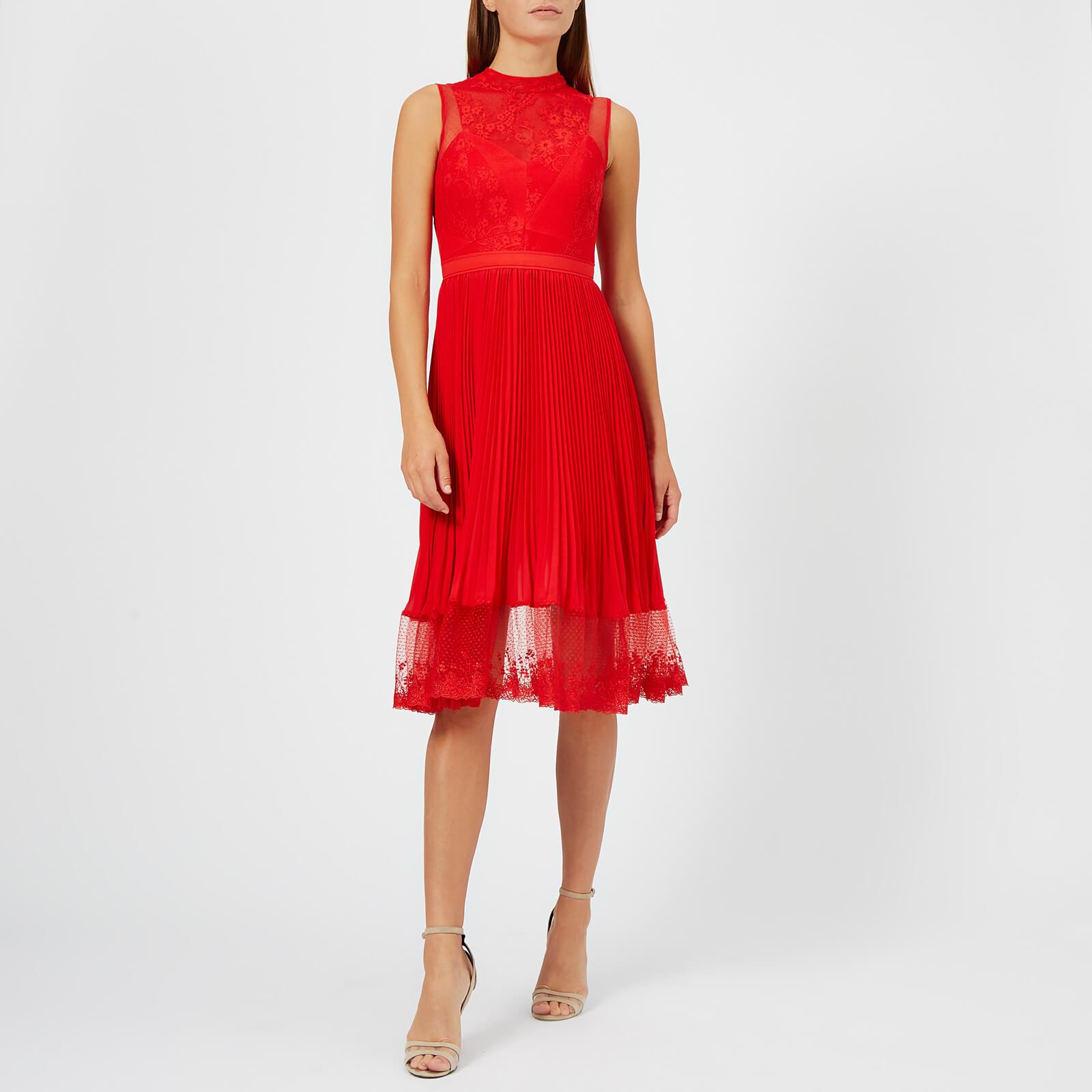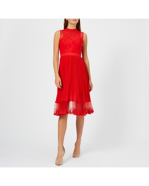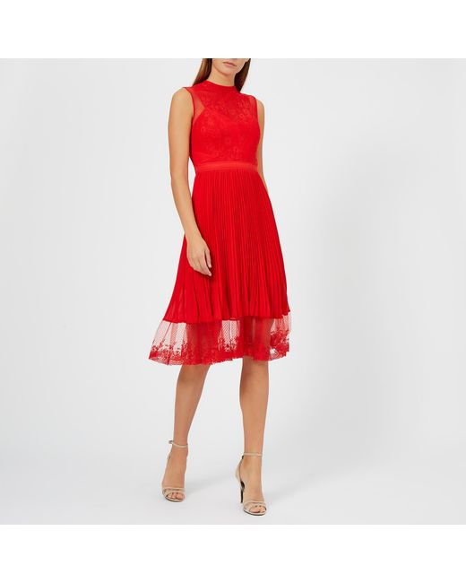 Women's 'Cherry Ripe' midi dress from Three Floor. Presented in a light, flowing fabric, the red dress features a floral lace bodice with a high neck, a sleeveless design and sheer polka dot mesh panels. The fit-and-flare silhouette falls into an A line skirt which boasts pleated detail and a sheer lace hemline. Concealed zip fastening to the nape. Lined. Top: 70% Polyamide, 30% Cotton. Mesh: 100% Polyamide. Skirt: 100% Polyester. Lining: 95% Polyester, 5% Elastane. Model is 180cm/5'11 and wears a size UK 8. Top: 70% Polyamide, 30% Cotton. Mesh: 100% Polyamide. Skirt: 100% Polyester. Lining: 95% Polyester, 5% Elastane. Colour: red