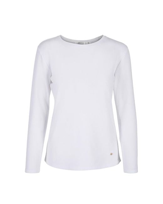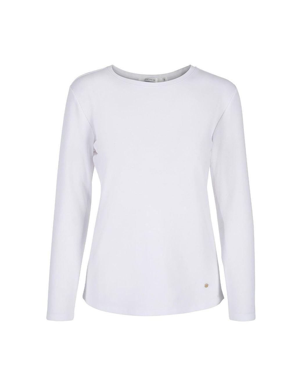 This comfortable long sleeve top is perfect worn with trousers or skirt, under a blazer, woollen pullover or worn alone with jeans. 92 % Cotton, 8% Polyamide. Machine wash 40 Degrees celsius. Do not tumble dry. Iron if needed. Colour: white