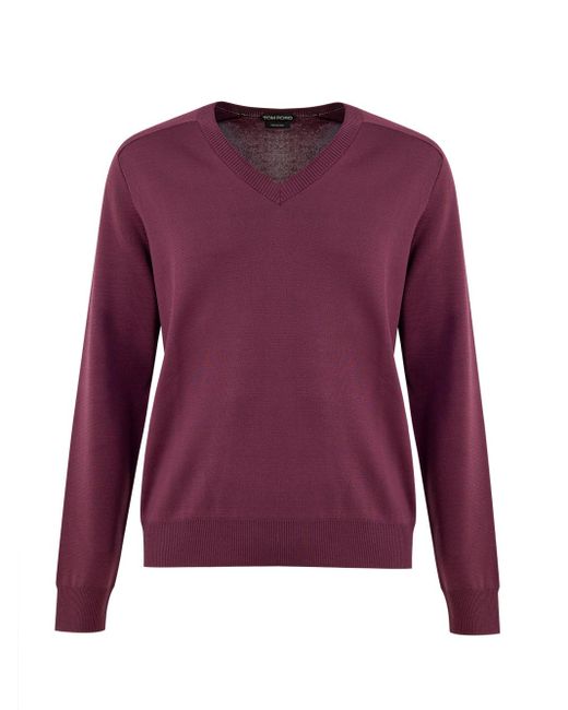 Tom Ford Purple Silk V-Neck Sweater. Shiny effect, soft to the touch, knit at the neck, cuffs and waist. Slim fit.Composition: 94% Silk, 5% Polyamide, 1% PolyurethaneSKU Brand: KVL009YMS028F23 GV699Internal SKU: 25AP18
