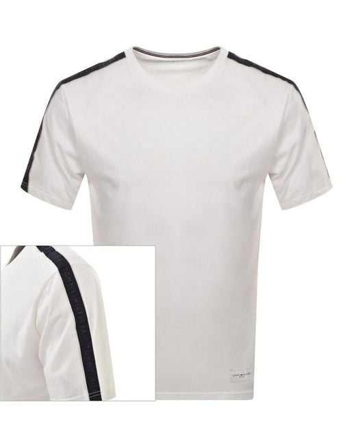 Tommy Hilfiger Logo T Shirt In Ecru White. A ribbed crew neck with short sleeves. Woven tape detail features on the shoulders and sleeves in navy and white with the signature Tommy Hilfiger logo embroidered in a repeating navy design. The signature Tommy Hilfiger logo patch is situated on the left above the hem in navy red and white. Top stitch detail in white. 100% Cotton. Colour: grey
