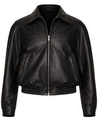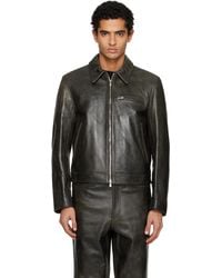 Go to SugarTony Wack black calf leather jacket with vintage treatment, classic collar, one chest zip heel, two front welt pockets, adjustable button strap detail at the back, button cuffs, straight hem. Colour: black
