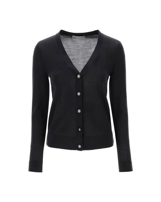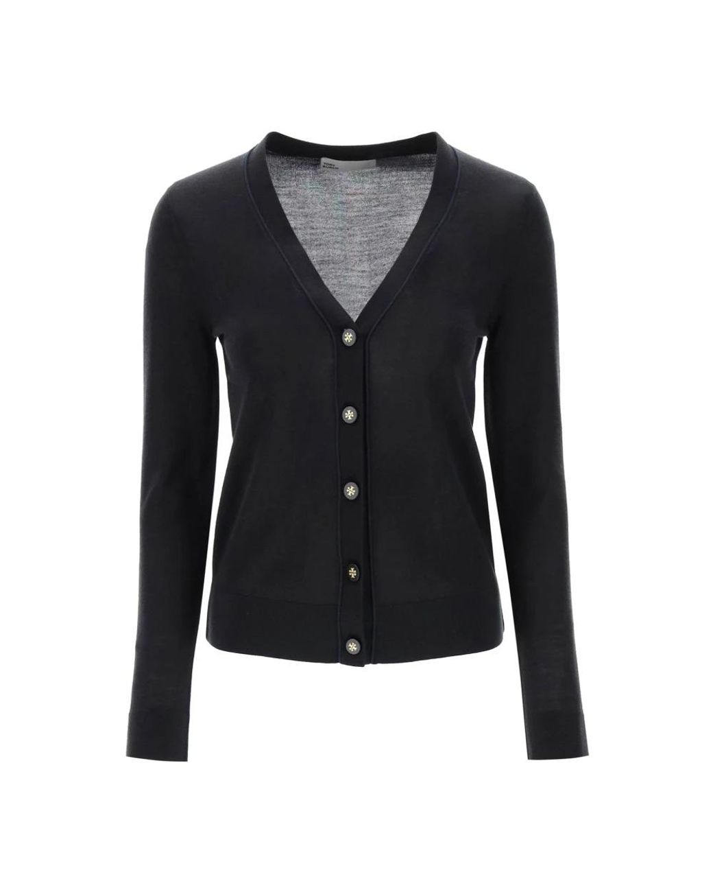 Elevate your knitwear collection with the Simone Cardigan by Tory Burch. Crafted from a luxurious wool and silk blend, this cardigan features a flattering V-neck and logoed button front closure. Key attributes: Black | Wool and Silk | V-neck | Logoed button front closure | Tonal piping | Dimensions & fit: Waisted fit | Composition & care: Wool | Silk Colour: blue