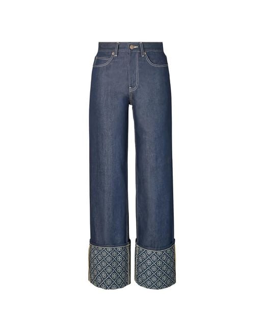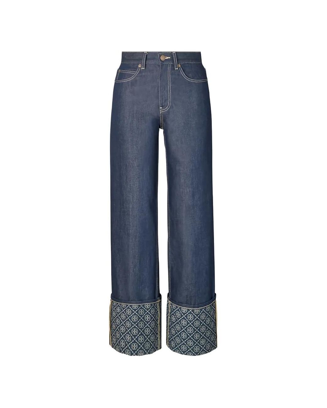 Women's Blue T Monogram Contrast-Cuff Jeans