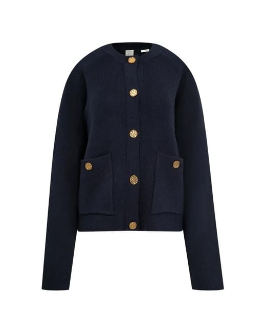 Navy blue round neck front button fastening long sleeves front patch pockets ribbed trim Size: M. Gender: Female. Material:RWS Wool/Elastane. Colour: blue