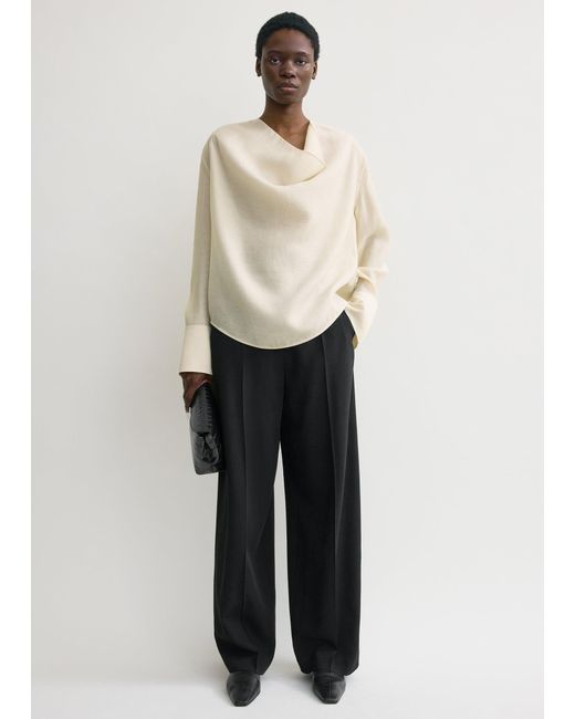Oversized blouse that effortlessly envelopes the body. It is crafted from diaphanous organza with a dramatic cowl neckline contrasted with neatly buttoned, elongated cuffs. Colour: white