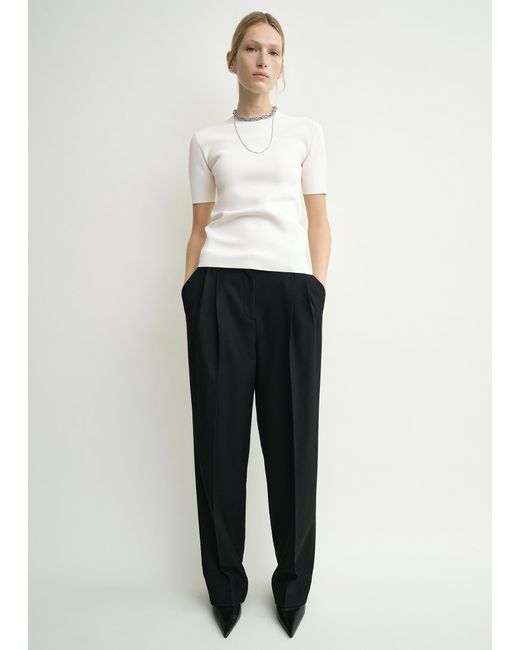 Designer’s note: "We go back to these trousers time and time again for their sophistication and ease. This variation is cut from our core tailoring fabric, which is a structured suiting canvas with dressed appeal. They have a relaxed silhouette with double pleats, and can be paired with anything from a simple tee to a neat blazer." Colour: white