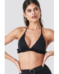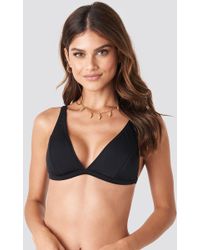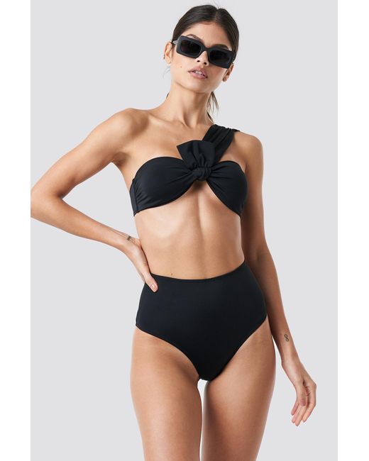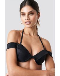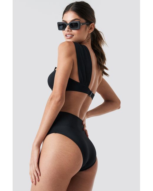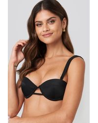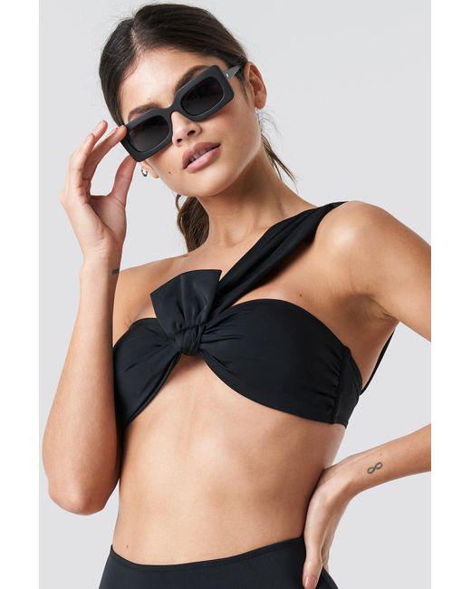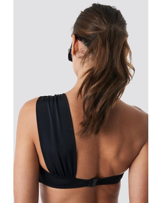 This bikini top by Trendyol features a hook-and-eye closure, shoulder straps with a one shoulder look, a removable padding and a tie detail at the front. This bikini top comes in black. 81% Polyamide, 19% Elastane. Colour: black