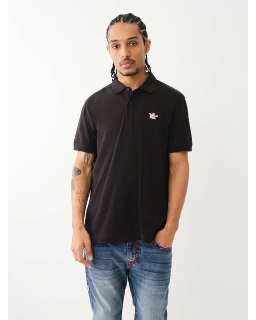 Pop that collar with the Buddha Patched Logo Polo Shirt. Crafted from soft cotton, this men’s polo features a basic collar. half-button placket, and short sleeves. Finished with a relaxed fit, ribbed trim, and a chest Buddha patch. Colour: black