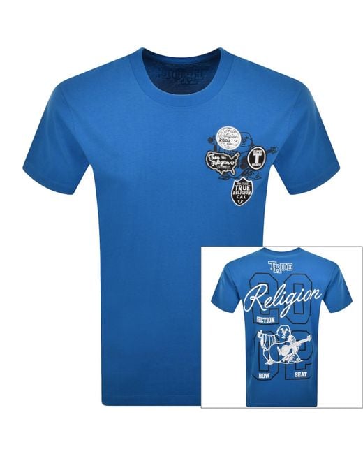 True Religion University T Shirt In Imperial Blue. A ribbed crew neck with short sleeves. The True Religion logos are situated on the left of the chest and a larger versions on the reverse. 100% Cotton. Colour: blue