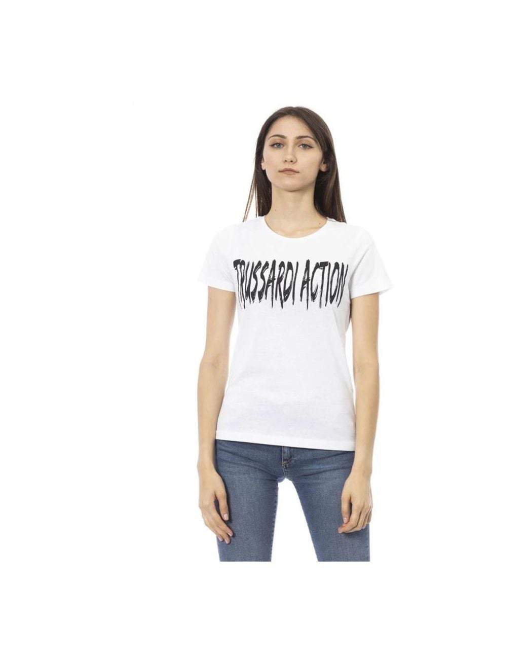 Elevate your casual wardrobe with this elegant Trussardi short sleeve tee featuring a chic front print. Made from a high-quality blend of 90% cotton and 10% viscose, this classic round neck tee is a perfect combination of leisure and luxury. Proudly originating from BD, this white tee is a must-have for any stylish woman. Colour: white