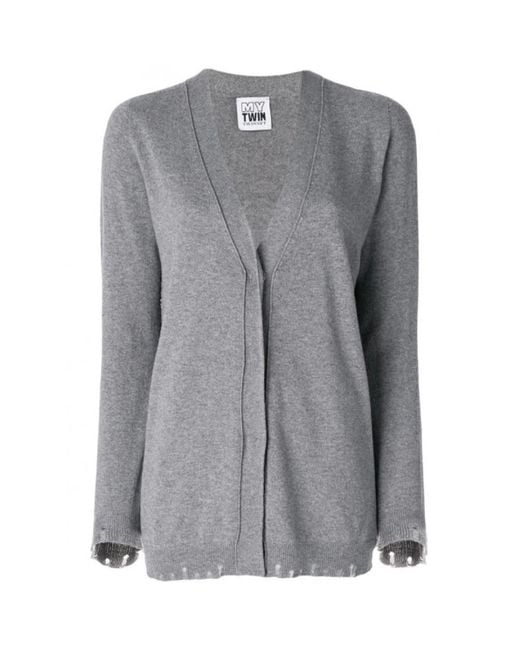 Stay cosy and stylish with this classic long cardigan from Twinset. Crafted from a blend of wool, this piece features long sleeves and frayed details on the hem and cuffs. Perfect for adding a touch of elegance to any outfit. Colour: grey