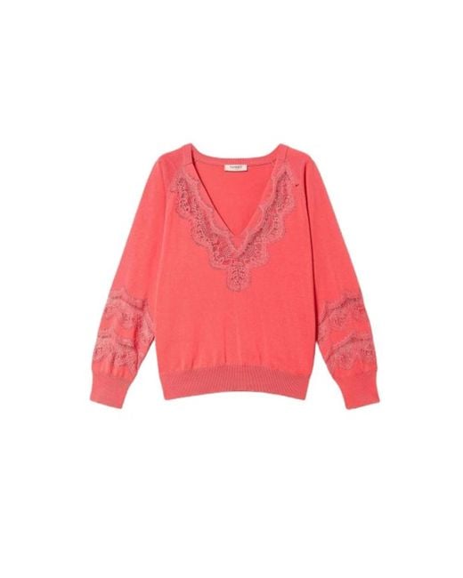 Elevate your style with this Twinset Maxi V-neck Knitwear. Made from 100% cotton, this loose-fitting jumper features ribbed finishes and intricate embroidery details on the V-neckline and cuffs. A must-have in every woman's wardrobe, this lace-adorned version adds character and romance to any silhouette. Colour: red