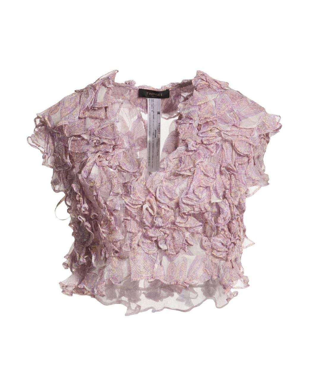 TWINSET. ruched shirt, georgette, paisley-print, no appliqués, scoop neckline, short sleeves, button fastenings, dry clean, do not bleach, do not tumble dry. 100% Silk.