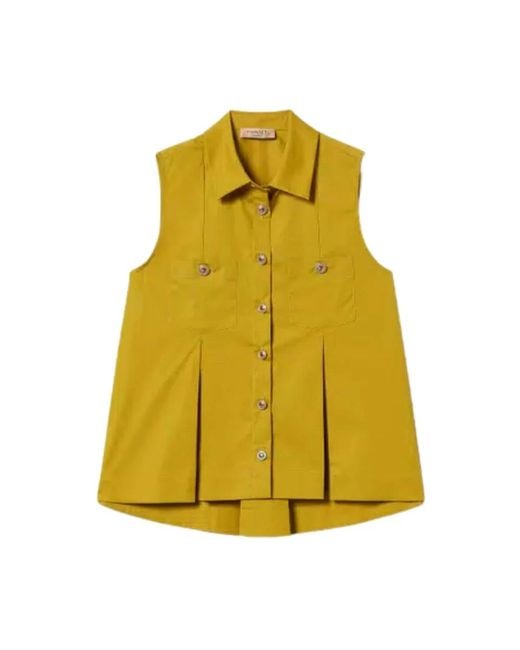Twinset Sleeveless Poplin Shirt combines a feminine fit & flare cut with structured poplin for a contemporary, versatile top. Its standout details — chest patch pockets and front pleats — create movement and polish for tailored or coordinated looks. Key attributes: Green | Pistacchio | Cotton poplin | Slight stretch for comfort | Chest patch pockets | Front button closure with metal logo buttons | Sleeveless | Front pleats that define volume | Classic collar | Dimensions & fit: Fit & flare silhouette | Composition & care: Cotton | Elastane Colour: yellow