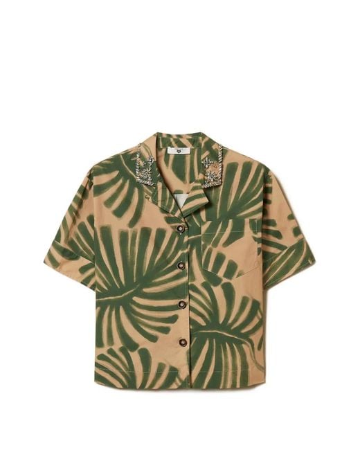 Beige/green jungle print embroidery button fastening short sleeves poplin cotton Size: XS. Gender: Female. Material:Cotton. Colour: green