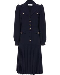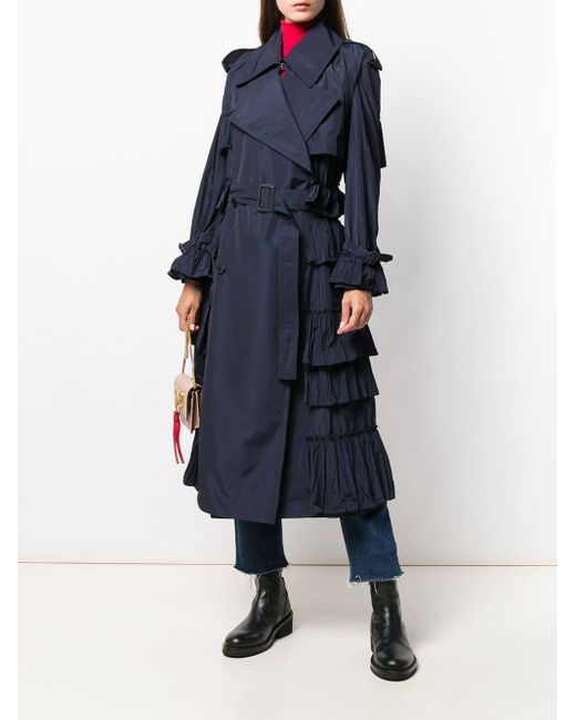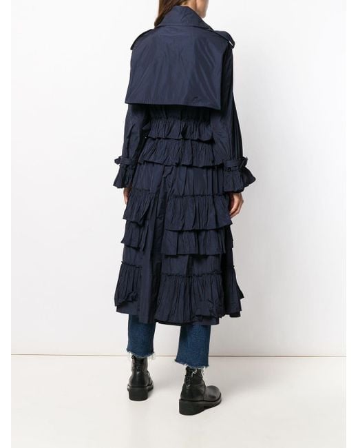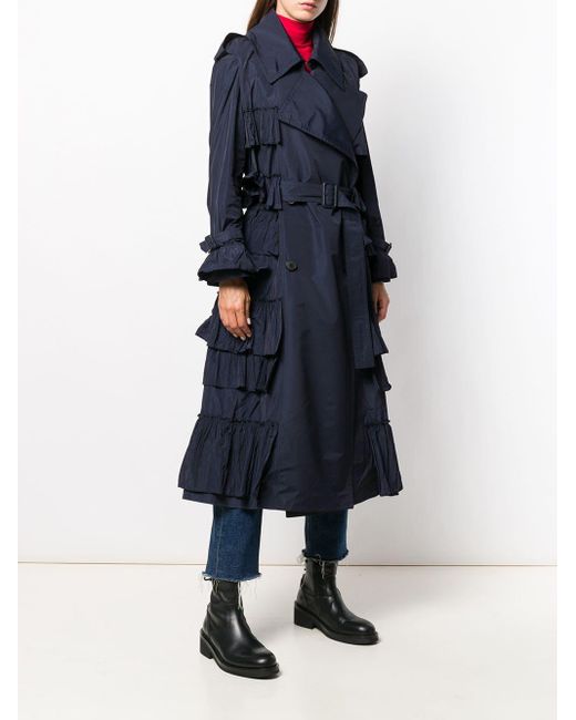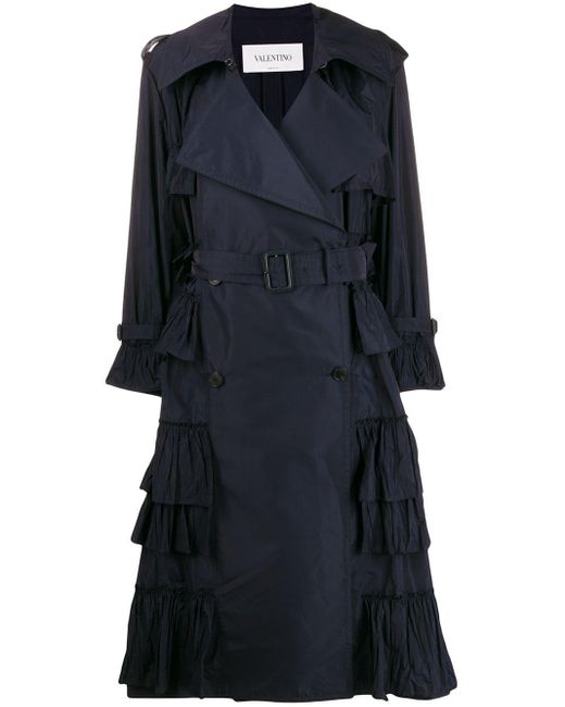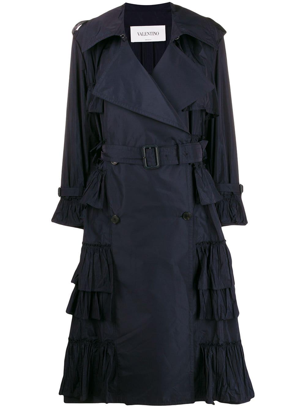 Capture the essence of Italian luxury and glamour with the latest Valentino collection, as seen in this navy blue double-breasted pleated trench coat. Featuring a notched collar, a belted waist, long sleeves and a mid-length. Material:Calf Leather/Polyester. Colour: blue