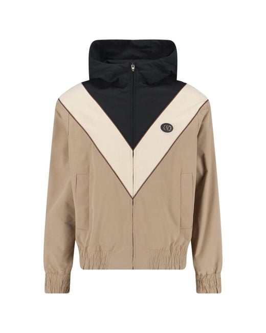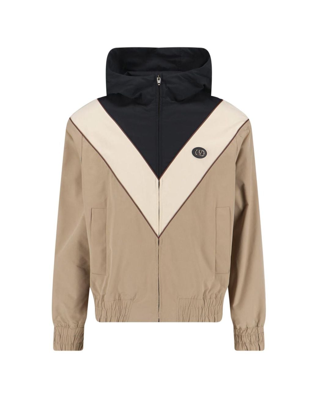 Hooded zip-up jacket in a colour-block construction featuring a beige body, ivory V-shaped chevron panel on the front and back, and a black hood and upper yoke. Panels are separated by dark brown piping. Centre-front zip closure with a branded designer V logo pull. Attached oversized hood with two antique gold-tone D-ring eyelets and a zip fastening at the neck. Elasticated hem and cuffs. Circular black leather-trimmed VLogo badge with gold-tone metal hardware applied to the chest. Colour: natural