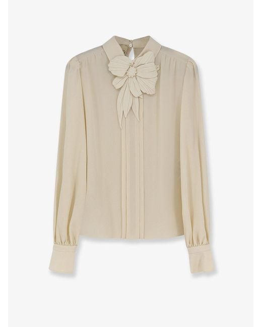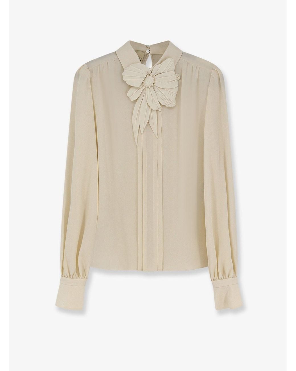 Double button closure at the back Long sleeves with cuffs and covered button Pleats at the front Silk flower detail Made in Italy 100% silk SKU: 8B0AEBX021BAD6 Colour: white