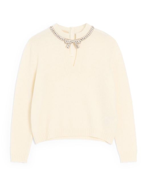 This pure wool jumper by designer embodies the House’s storied design philosophy, serving as a timeless showcase of savoir-faire and Italian craftsmanship. Its soft knit offers warmth and comfort, while the embellished bow detail above the neckline nods to the label’s characterful, time-honoured codes. Colour: natural