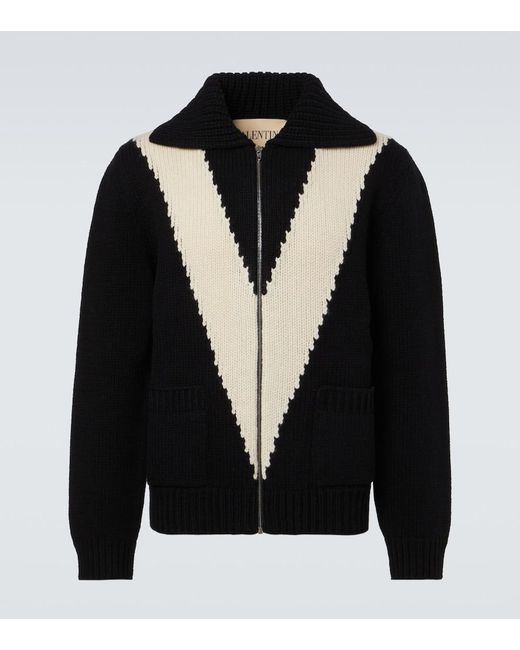 Men's Black Intarsia Virgin Wool Zip-Up Cardigan