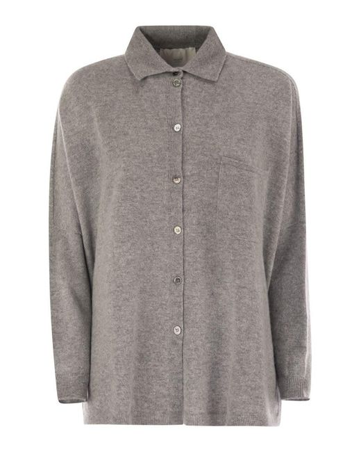 Soft and warm, this new shirt-style jumper with a pointed collar in pure cashmere and brushed wool has a comfortable, feminine design. The soft lines and slightly dropped shoulders complete the look. - shirt collar - dropped shoulders - brushed wool knit - button fastening designer id: v53604 grigio medioSpecificationValueSeasonFW25Composition100% CASHMEREColorGREYColor CodeGRIGIOMEDIOMade InITALYISOITDepartmentWomenSectionCLOTHINGSubsectionSHIRTSSize InformationSTANDARDSize CodeSML Colour: grey