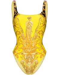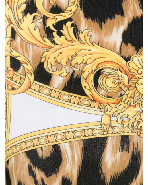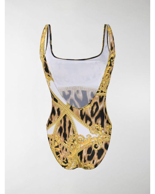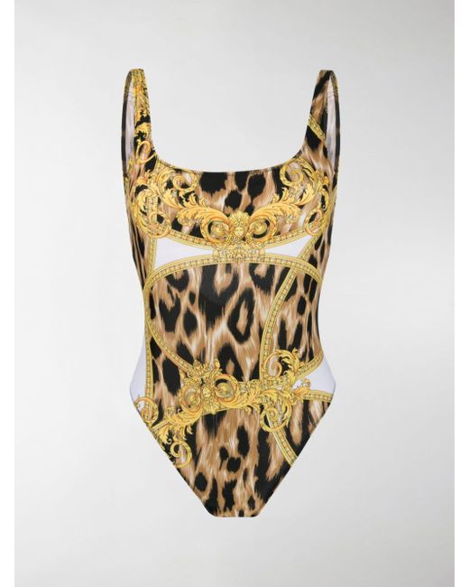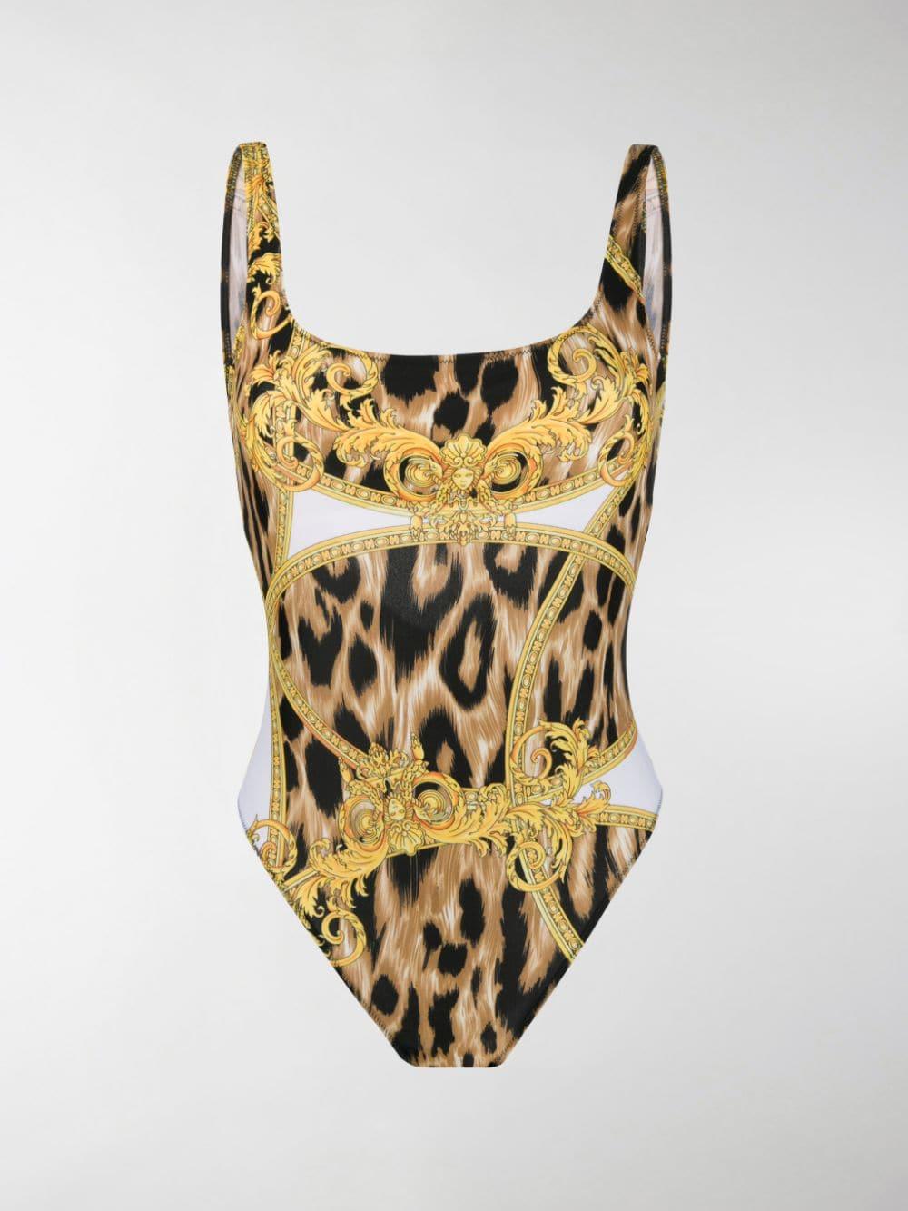 Donatella pays tribute to her late brother Gianni Versace by bringing his original designs back to the forefront of the label. Archival prints, iconic motifs and retro-inspired details are reinvented for the new collection. This yellow and black swimsuit from Versace features a round neck, elasticated straps and the iconic Baroque pattern layered above a leopard print. Colour: white