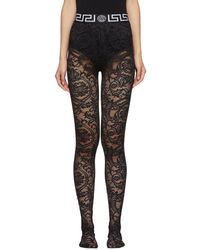 Thigh-high stretch lace nylon stockings in black. Graphic pattern knit throughout. Colour: black