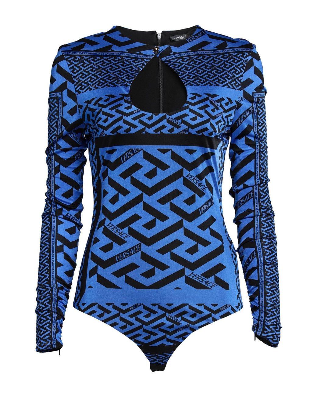 VERSACE. jersey, brand logo, frills, two-tone, crewneck, long sleeves, crotch of body. 100% Viscose. Colour: blue
