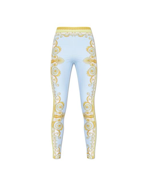 Versace Printed Leggings pair a striking baroque botanical print with a slim, ankle-length silhouette for elevated everyday wear. The high waist and smooth, slight-sheen finish combine style with comfortable stretch. Key attributes: Blue | Light blue | Nylon | Stretch fabric | Smooth finish | Subtle sheen | High waist | Elasticated waistband | Baroque botanical print | Decorative border motif | Ankle-length | Dimensions & fit: Model height: 177 cm | Model bust: 83 cm | Model waist: 61 cm | Model hips: 89 cm | Model is wearing size: 40 | Slim fit | Composition & care: 78% Nylon | 22% Elastane | Refer to product label for care instructions. Colour: blue