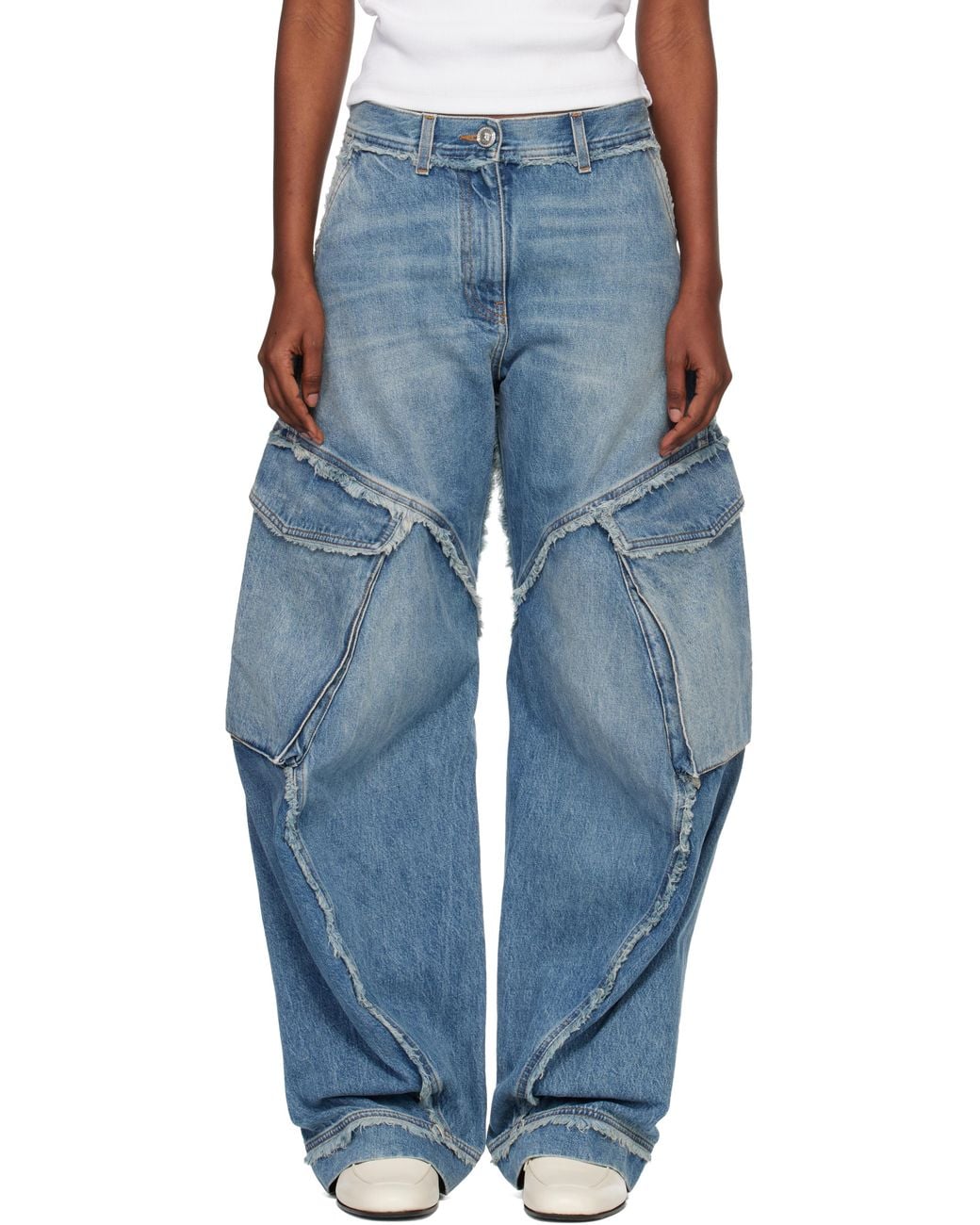 Non-stretch denim jeans. · Fading, whiskering, and frayed edges throughout · Low-rise · Belt loops · Four-pocket styling · Cargo pocket at outseams · Logo patch at back waistband · Contrast stitching in tan Supplier color: Medium blue Colour: blue