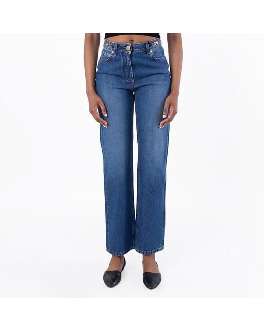 Versace Ladies Bottoms. Fashion category: Jeans & Denim. SKU: 1011519 1A07079 1D100. Color: Dark Blue. Versace Medusa 95 Regular-Fit Denim Jeans. These stone-washed jeans feature a regular fit, straight leg and are detailed with a Medusa 95 emblem at the pocket. Designed with belt loops, a five-pocket construction, and a back leather logo patch, they are finished with a zip fly and button fastening. 100% Cotton. Made in Italy.