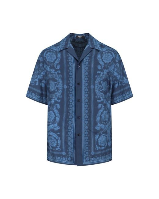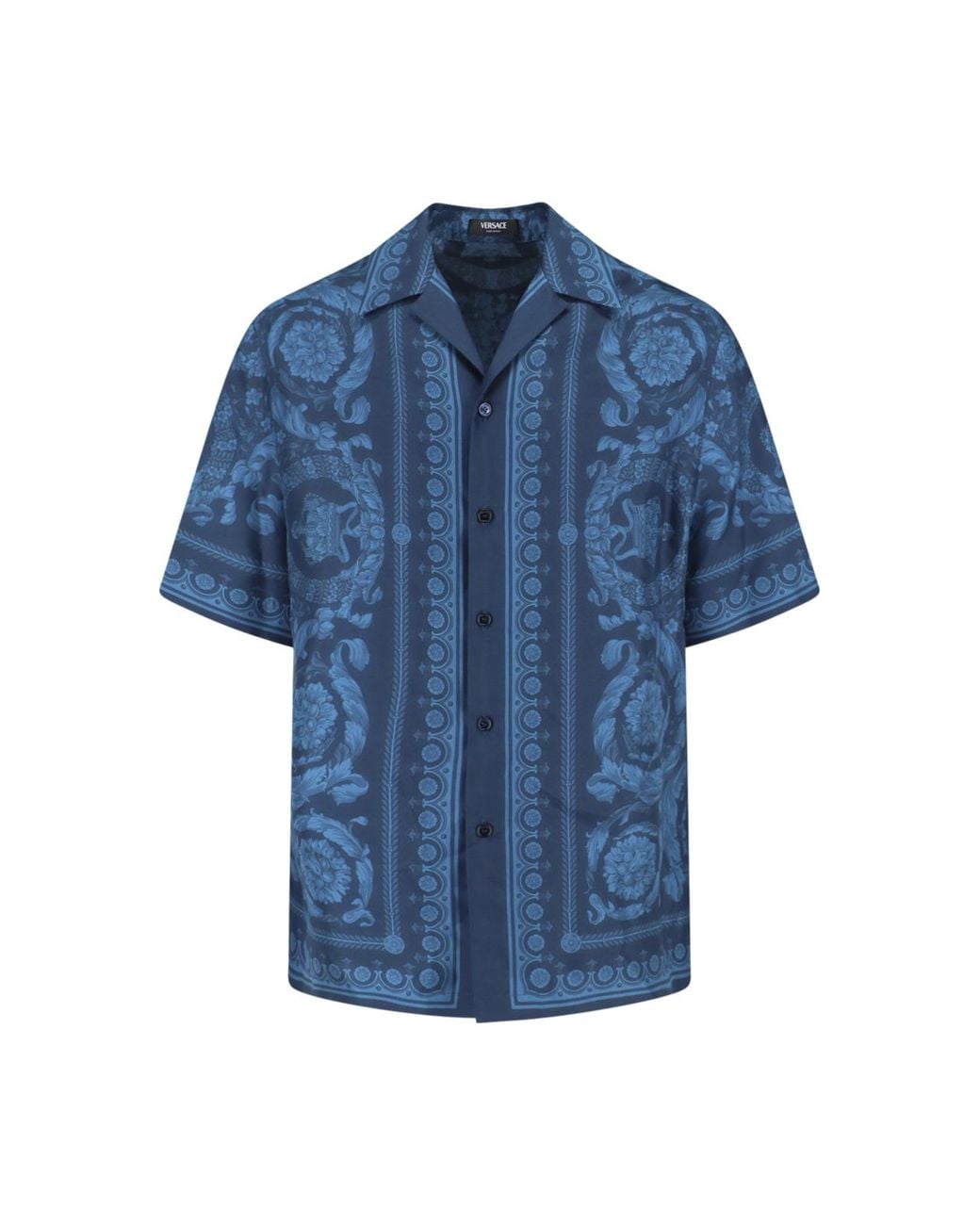 Short-sleeve camp-collar shirt in navy blue silk with an all-over tonal baroque print featuring floral medallions, scrolling acanthus leaves, and ornamental borders in a lighter blue. The front displays vertical stripe-style border motifs flanking a central button placket with dark Versace-engraved buttons the back features a large circular floral medallion with a crown motif at the base. Straight hem, short sleeves with printed cuffs. Colour: blue
