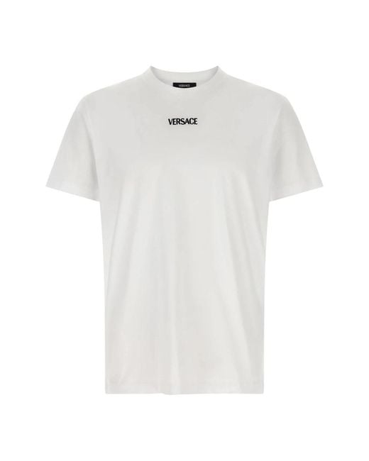 Versace Embroidered Cotton-Jersey Slim T-Shirt combines a slim silhouette with a distinctive embroidered logo for a refined everyday tee. Key attributes: White | Bianco | Cotton | Ribbed crew neck | Short sleeves | Contrasting logo embroidery on front | Straight hem | Dimensions & fit: Height: 185 cm | Chest: 94 cm | Waist: 75 cm | Hips: 93 cm | Shoulders: 48 cm | Slim fit | Model is wearing size M. | Composition & care: 100% cotton | Embroidery: 100% polyester | Trim: 100% cotton