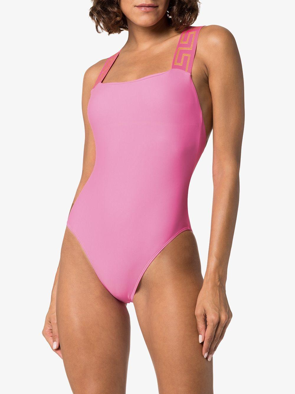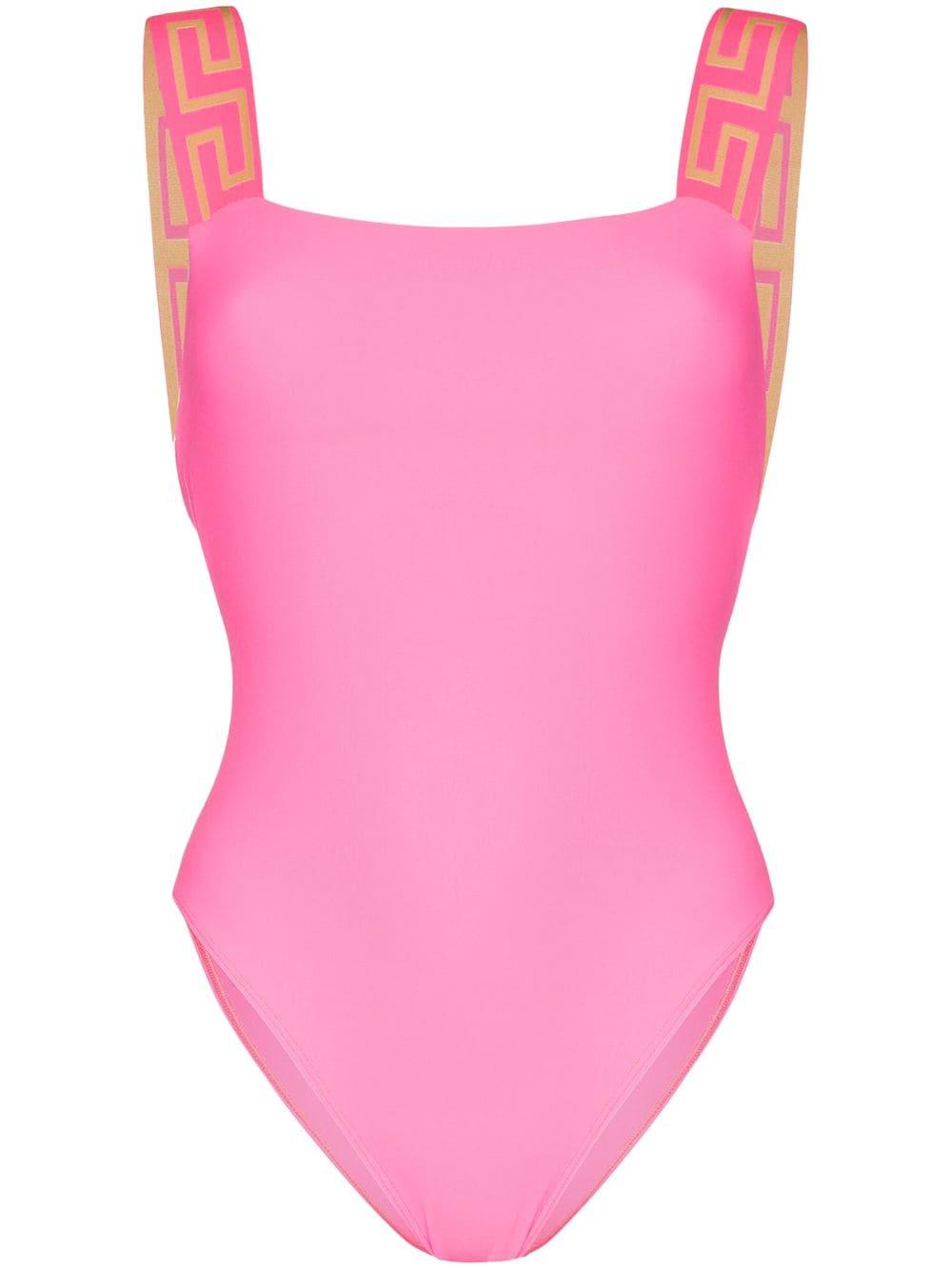 Donatella pays tribute to her late brother Gianni Versace by bringing his original designs back to the forefront of the label. Archival prints, iconic motifs and retro-inspired details are reinvented for the new collection. This pink Greek Key-trimmed swimsuit from Versace features a square neck, a sleeveless design and a low back. Swimwear must be tried on over your own garments. Material:Polyamide/Spandex/Elastane.