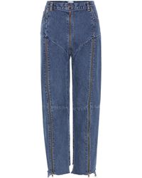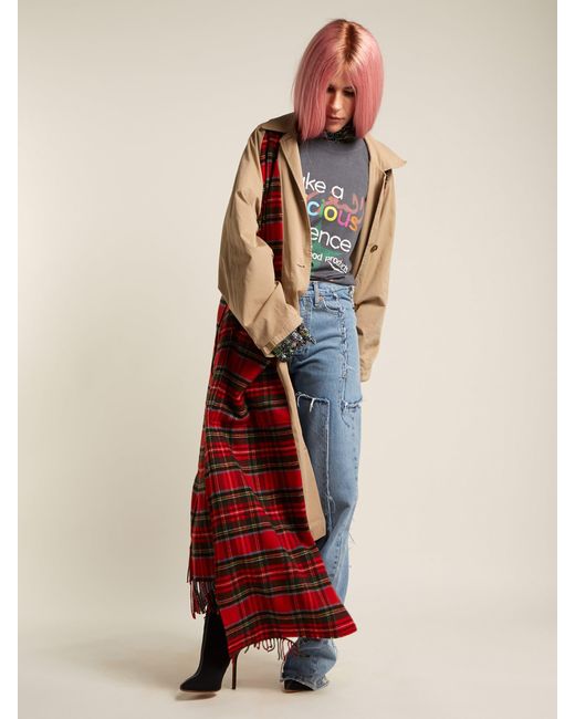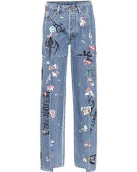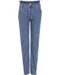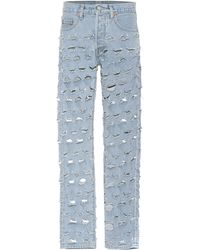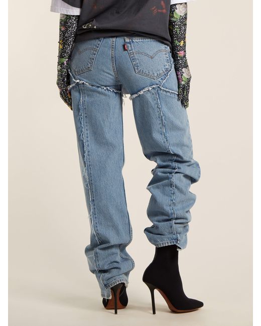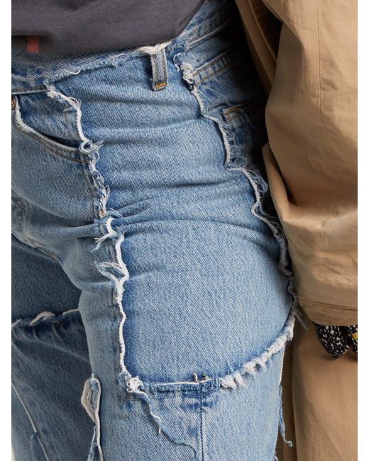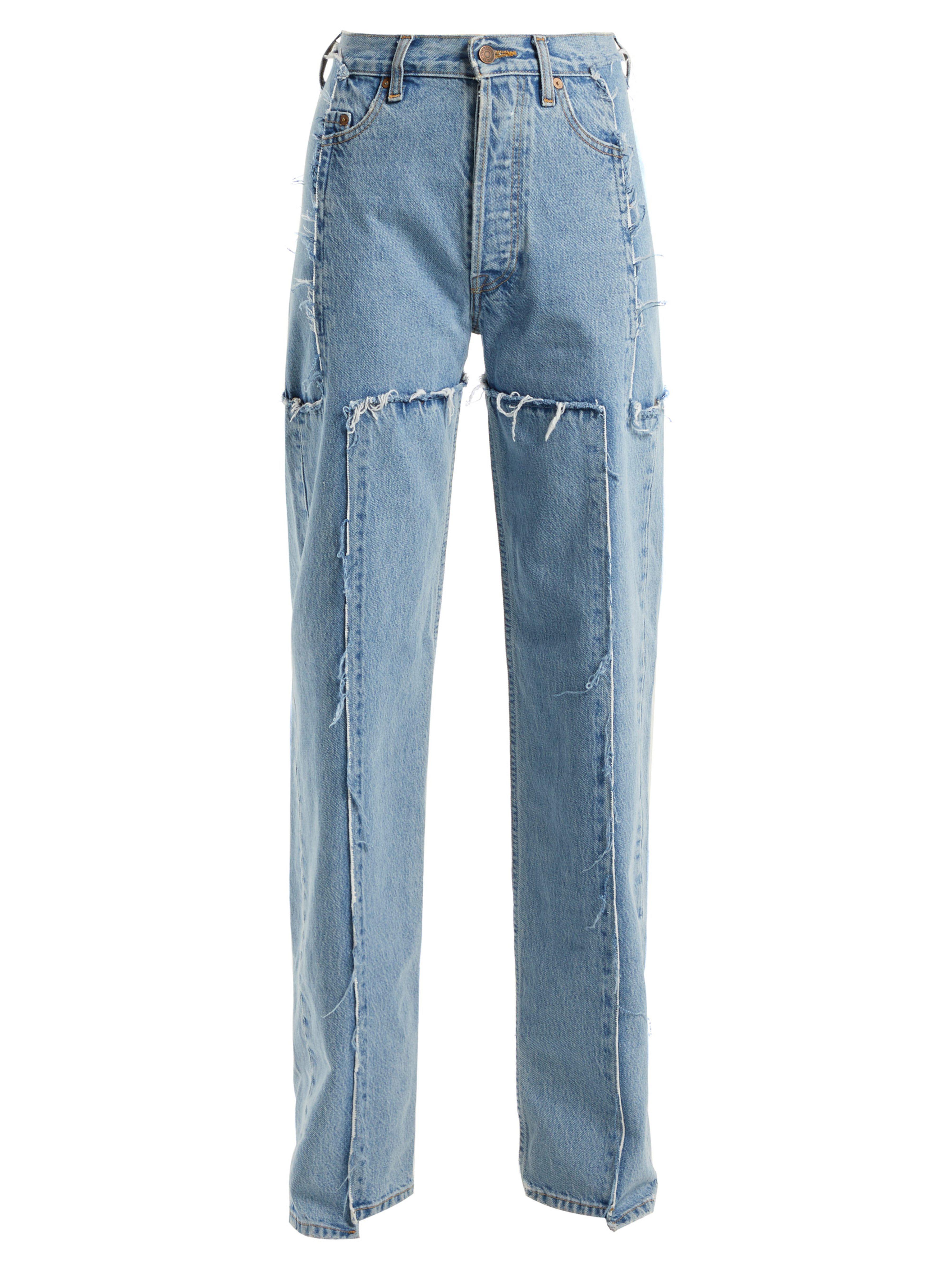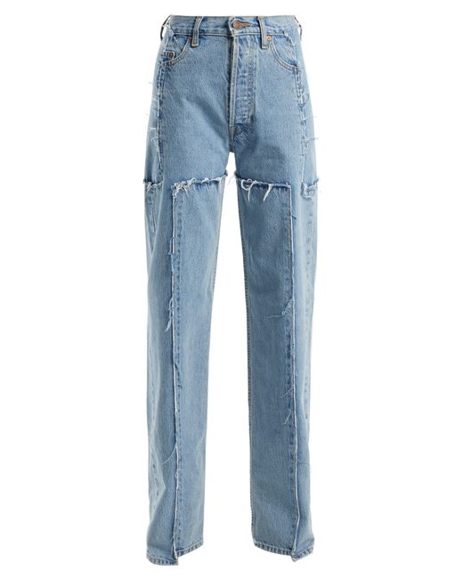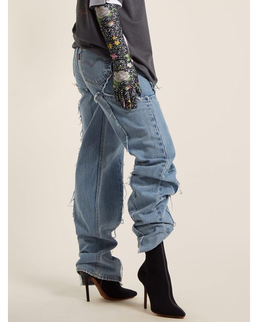 Vetements applies its ever conceptual approach its industrial A W18 collection, in which clothing is distressed, deconstructed and fused – as seen in these blue jeans. They're crafted from frayed panels of Levi's denim and sit high on the waist. Elevate on black stiletto boots to sharpen the oversized fit. COTTON. Colour: blue