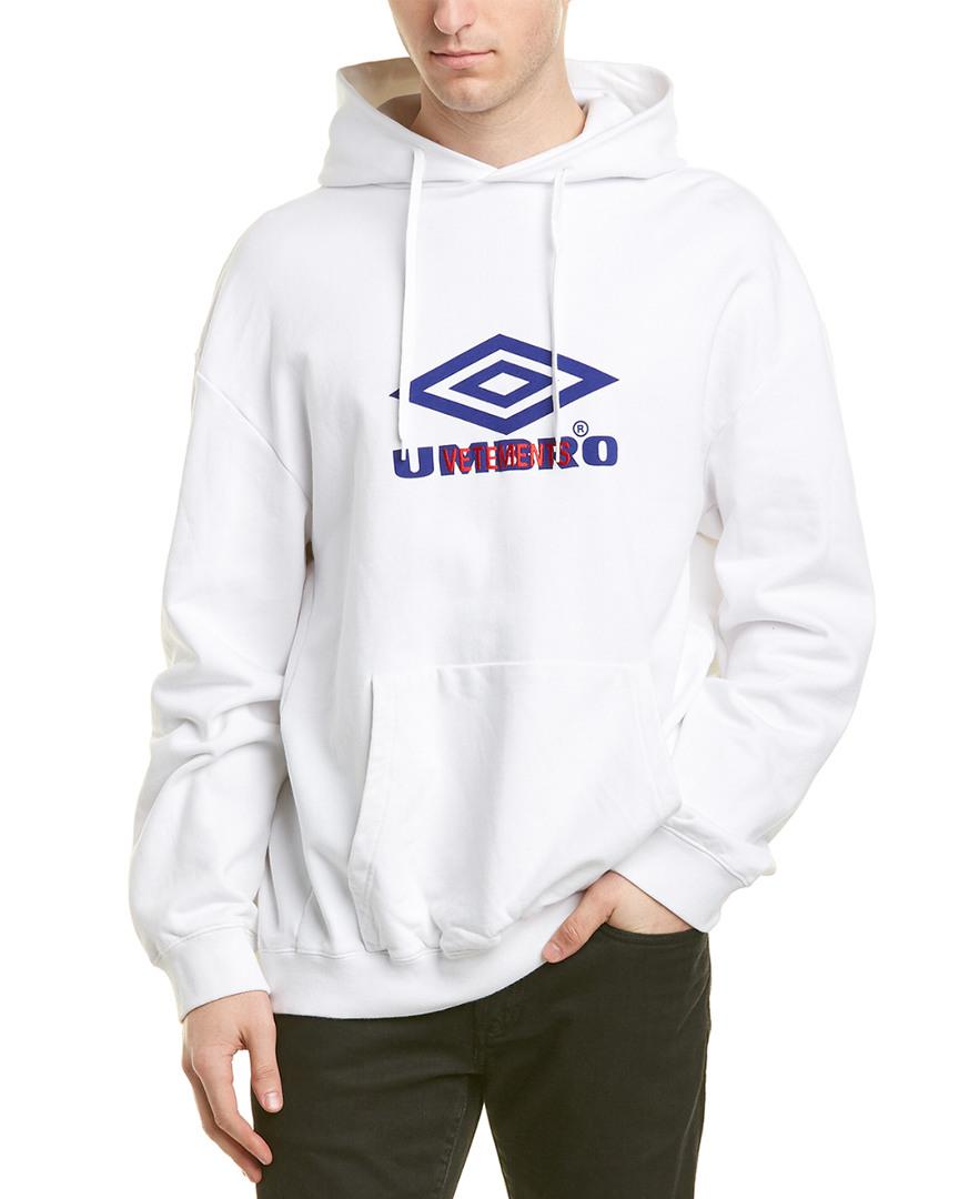 White oversize cotton sweatshirt featuring drawstring hood from Vetements x Umbro. Decorated with a print and stitched blue and red logo. 2 slip pockets at front. Elasticated hem and cuffs. 96% Cotton. 4% Elastane. Model's Measurements. Height: 193cm. Chest: 95cm. Waist: 82cm. Hips: 93cm. Model is wearing size: S.