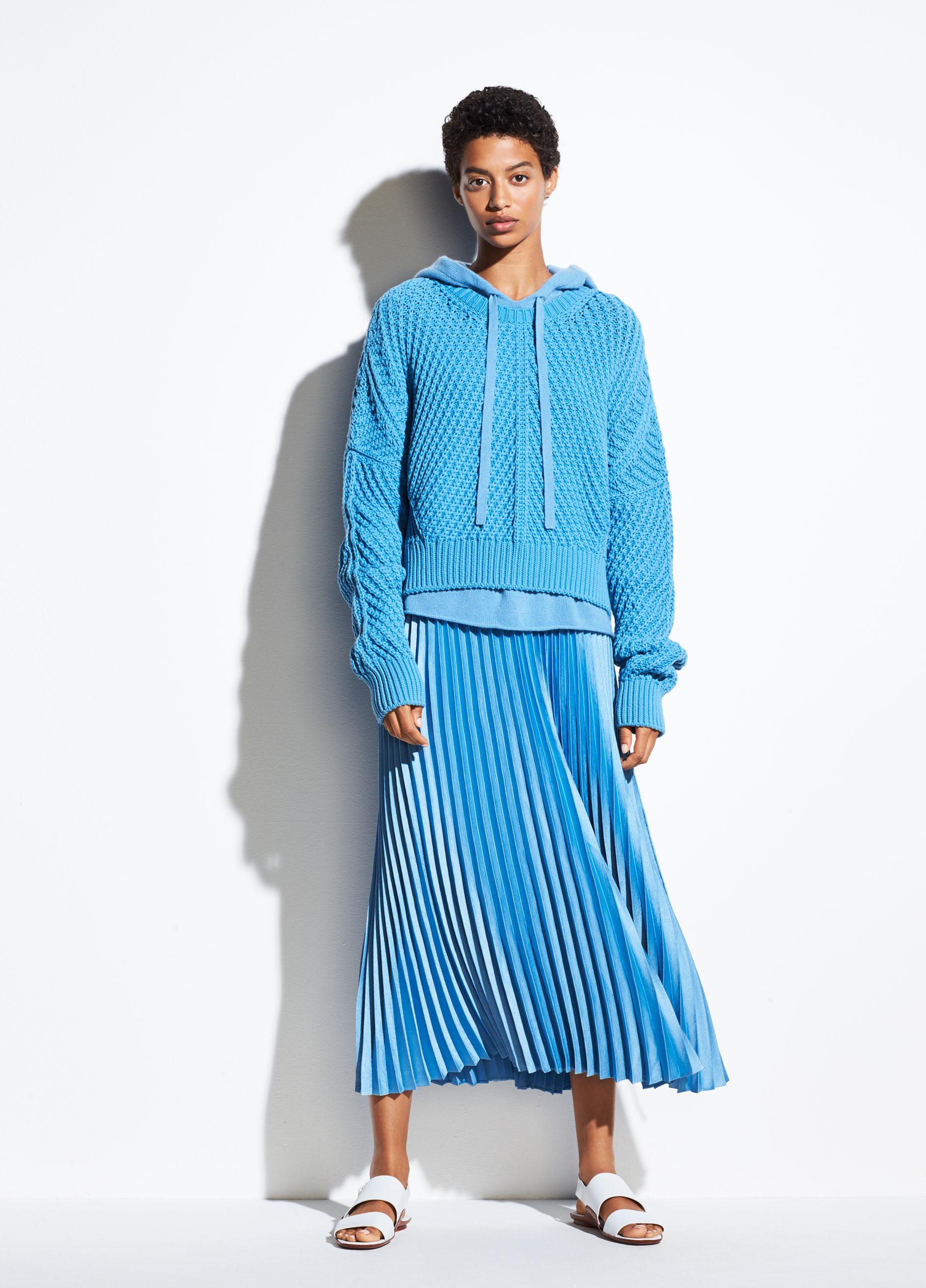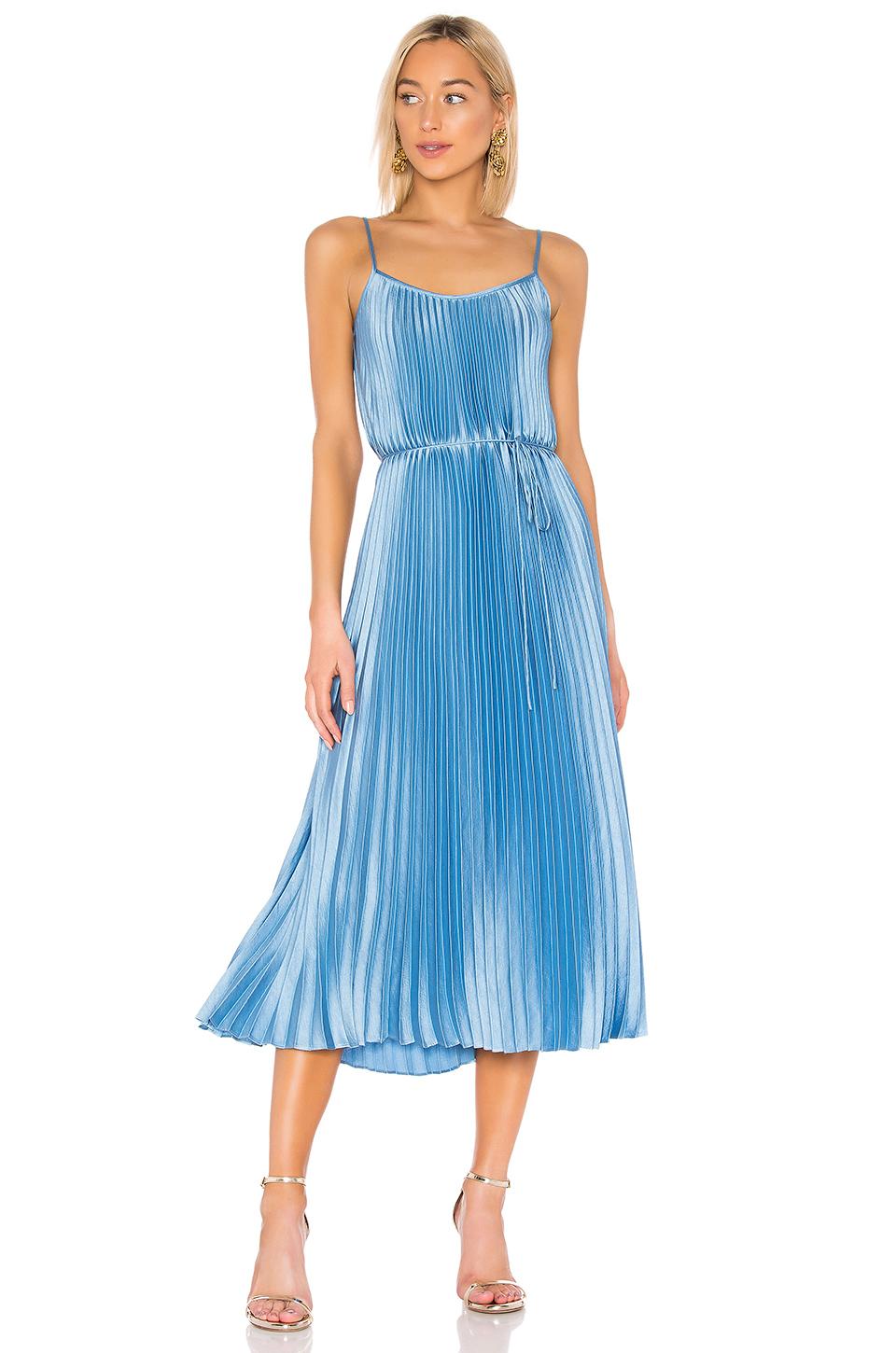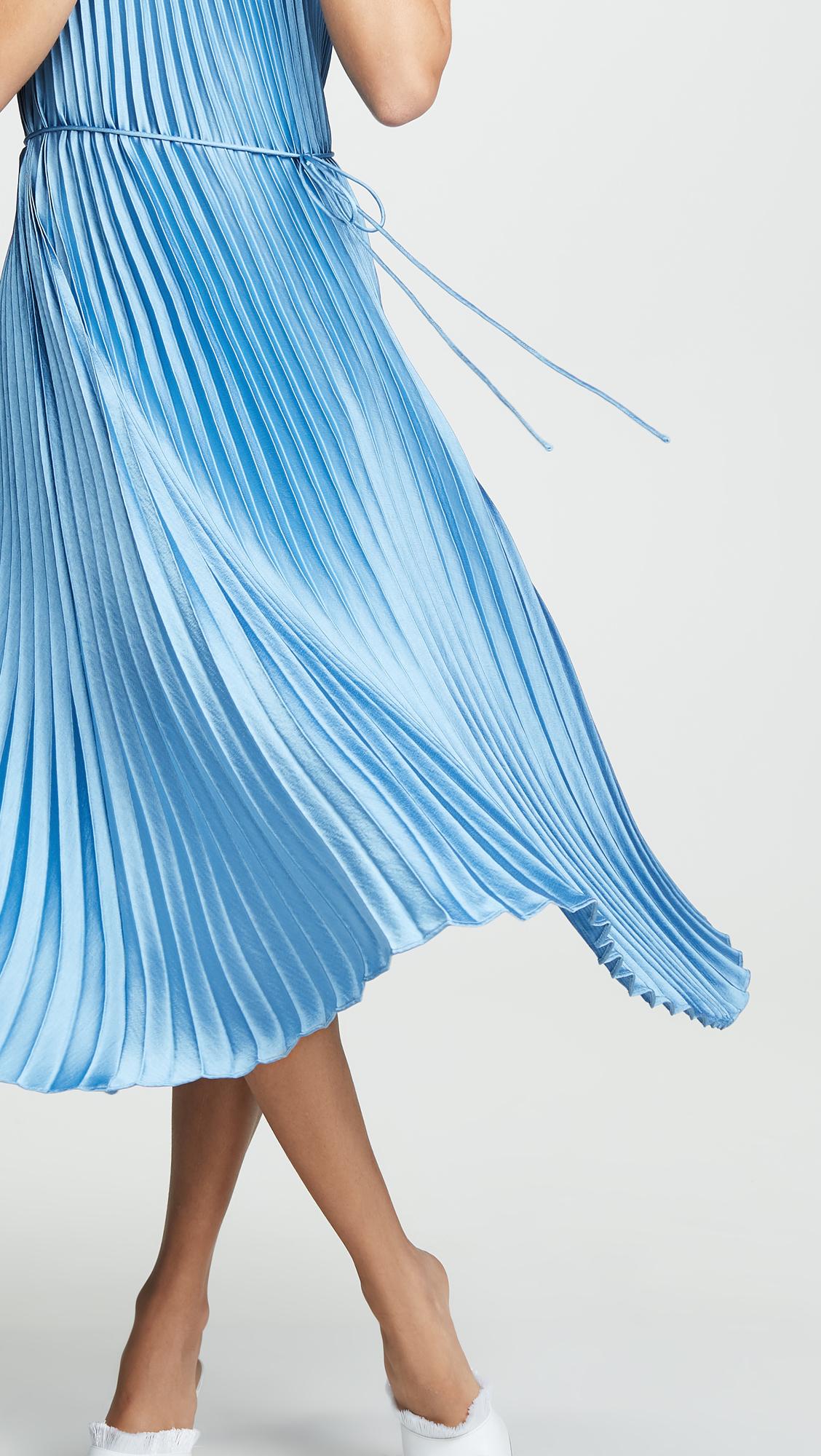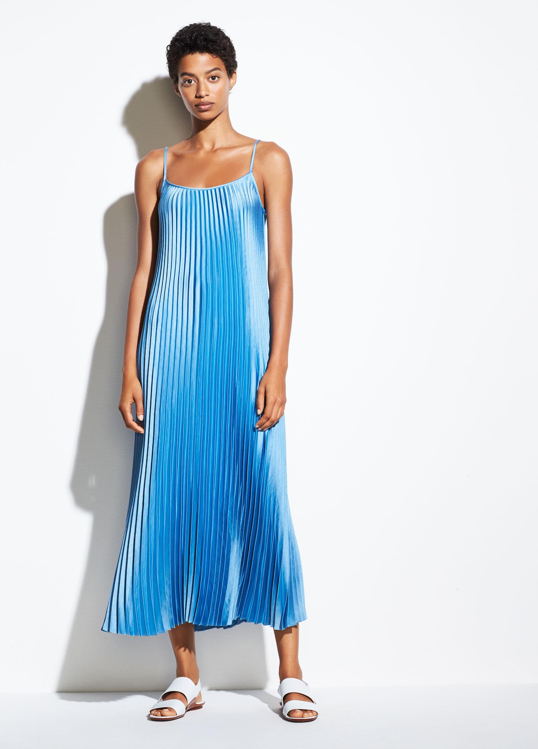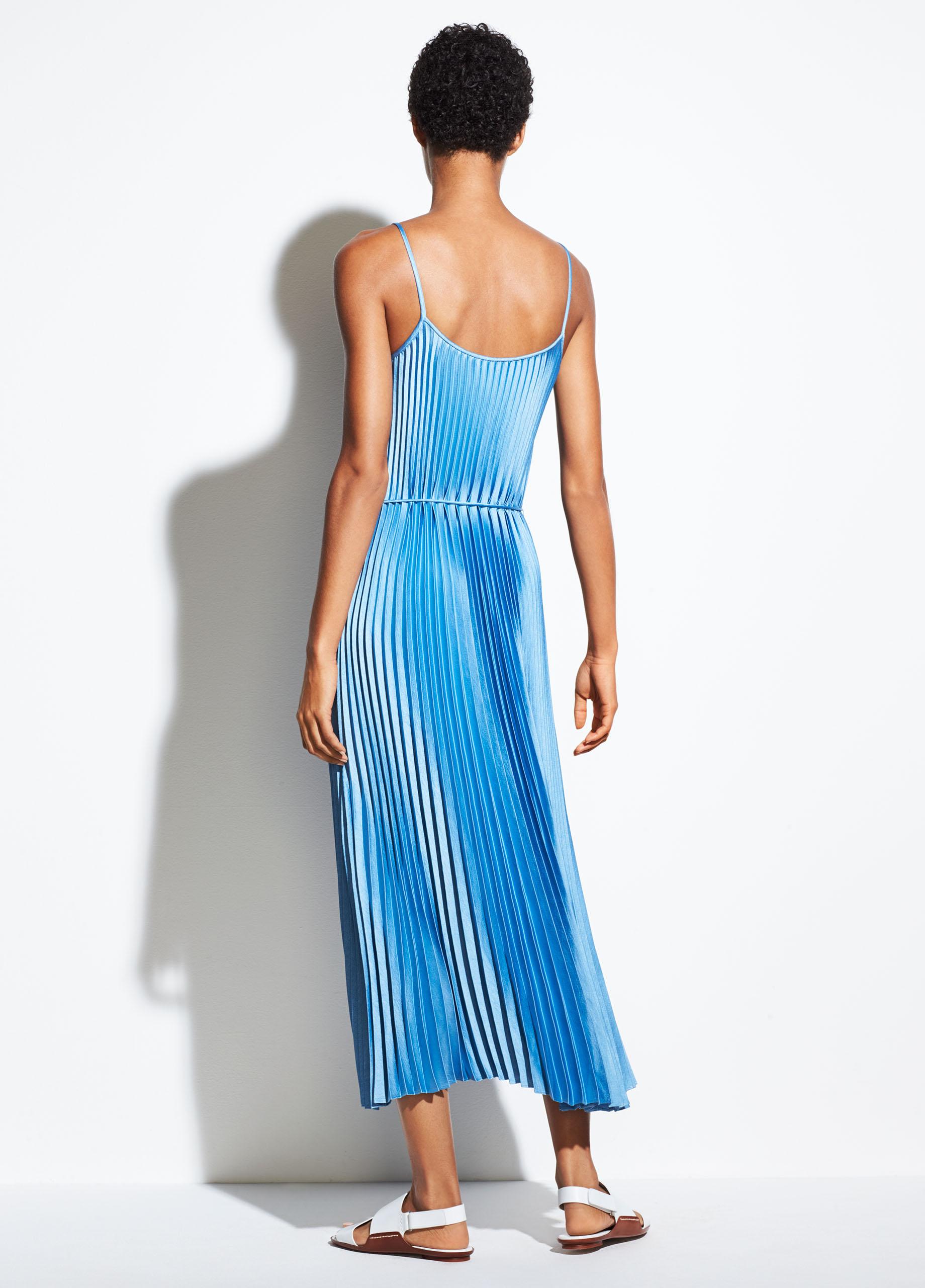 Fabric: Charmeuse. Neckline to hem pleats. Side slits. Optional self belt. Knee length. Sleeveless. Tie at waist. Open back. Shell: 100% polyester. Unlined. Hand wash or dry clean. Style #VINCE49978. Length: 40.25in / 102cm, from center back. Enlivened with pretty pleats and ice-blue color, this Vince slip dress is a total delight. Round out this look with a simple pair of pumps or sandals.